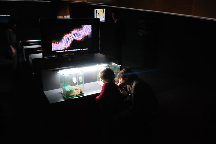 The exhibition is not just for snobs. True, in this way was also important not to overdo it. Sam D. Zimin "Dynasty" with rare exception it is focused on supporting science and scientific and educational projects. Art - in fact not his theme. It's one thing when such a project come with ready-leading product multimedia art, as did the "garage" with the imported project Decode: touch to digital art (until 10 April). A quite different - to offer its own new project with new works. A face is thin, there is always a risk of bias - the possibility of art to fall in the "Technical Museum" and "visual aids" for lessons in physics and biology. Now I can exhale - the whole project did not go to the didactic manner. Visitors meets spectacular sculpture program "Model biometric reflections" Demetrius and Helena Kawarga - a new, complicated thing, especially for this exhibition. It provides multiple interfaces - the connection points of spectators. Sensors read the blood flow rate or the activity of the cerebral hemispheres, or electrical activity. Depending on the parameters at the entrance inside a transparent plastic shell servos drive the complex sculptural design: Rubber beating "heart" move "thread" and "ropes". This, incidentally, is perhaps the only object that will not be completely lost in case of power failure. Motion stops, but the plastic component does not bleed. Among the most visually-attractive object can be noted 3D-installation "A dynamic model of the cell, Vladimir Grieg - the ball, which are projected close-ups of stem cells. It is not static, and the film that illustrates the processes occurring at the membrane surface. But even without knowing the background, you can get a visual pleasure - who could compete with the nature of inventiveness. Of the projects of international fame can not ignore robotic sculpture by German artist Ralf Becker (Ralf Baecker) «Space Computing" - a thinking fabric, web space, with wooden frames, with many servos. One of the leaders of the gaming genre is likely to become well-known multimedia installation Sniff. It is a computer projection of a live dog, created by Caroline Sobechkoy. Camera tracks the movement of the audience and give a response dog - from sniffing to aggression. However, the dog is fairly balanced. In the exhibition, which runs until April 17, 2011, exhibited 28 works by artists from around the world, performed with the assistance of scientific advisors. If you are going to hike to expect that the exhibition is not a "fast". Need to rely on the hour and a half of intellectual work. And probably not in one go. Get ready, that love is not everything - and it is absolutely normal. Artists today grope towards a future arts and the avant-garde is always challenging. Such is his life - not a version of science. watched the exhibition, Vladimir Bogdanov, ARTinvestment.ru The composition of the festival, "Life. Version of science "you can read here: http://elementy.ru/festival2011/exhibition Последний раз редактировалось Vladimir; 03.04.2011 в 17:36. Причина: Добавлено сообщение |