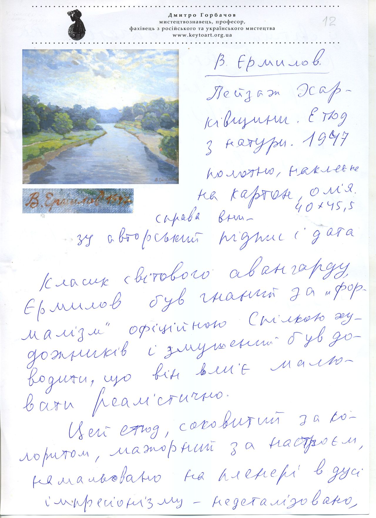 Conclusion D. Gorbachev. 2.Holst on cardboard, maslo.24 ,5-26 .1940-e. Attributed D. Gobachovym works; official site; www.keytoart.org.ua Tretyakov Gallery (Moscow): Dating of recent works by Malevich. Museum of Russia (St. Petersburg): Dating of recent works by Malevich. Museum of Modern Art, New York (Modern Art Museum, New York): dating works Bogomazova "Tyrsonostsy. National Art Museum of Ukraine (Kiev): atributirovanie works Exter, Gregory Levitsky, Bogomazova, Svyatoslavskaya, Malevich, Lisitsky, Moeller. Auction Sotheby's (Munich branch): atributirovanie works Bogomazova. Auction Bonham's: atributirovanie works of Samuel Adlivankin, D. Zagoskina. More ... MacDougall's Auction. Auction Christie's (Paris office): atributirovanie Exter. Auction Phillips: atributirovanie works Exter, Bogomazova. Museum of Performing Arts (Kiev): atributirovanie and dating of works Petritsky. Theater Museum. Bakhrushin: (Moscow): dating works Petritsky and Møller. Literary Museum (Moscow): atributirovanie poster Petritsky. Museum of Modern Art (Lodz): atributirovanie works Tsybisa. Collection Lobanov-Rostovsky (Lobanov-Rostovsky), London, curator of the collection of Professor John Boult (John Bowlt): atributirovanie works Petritsky, Khvostenko-Khvostov Yermilov, Tischler. |