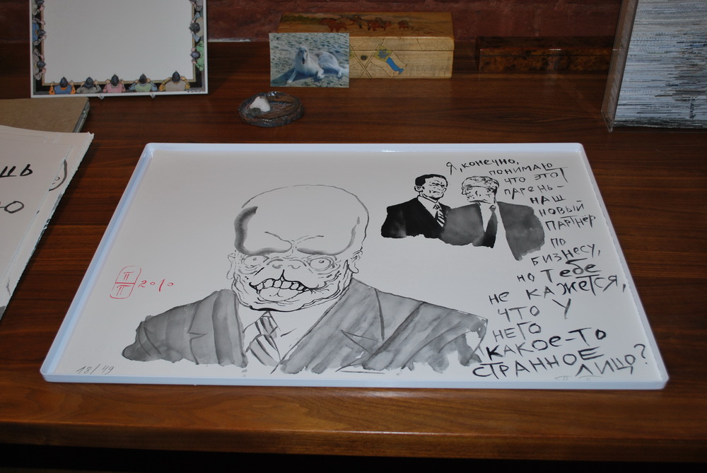Ходил на днях смотреть обновки коллекционера Александра Кроника. Оформленных под музейное стекло двух Яковлевых – сотбисовский «Портрет ветра» и абстрактное масло на бумаге. Вещи из собрания Костаки. Из других интересных новинок – альбом тиражной графики Павла Пепперштейна "Пушка" и сердце" (?) и соковский Ленин-Джакометти.