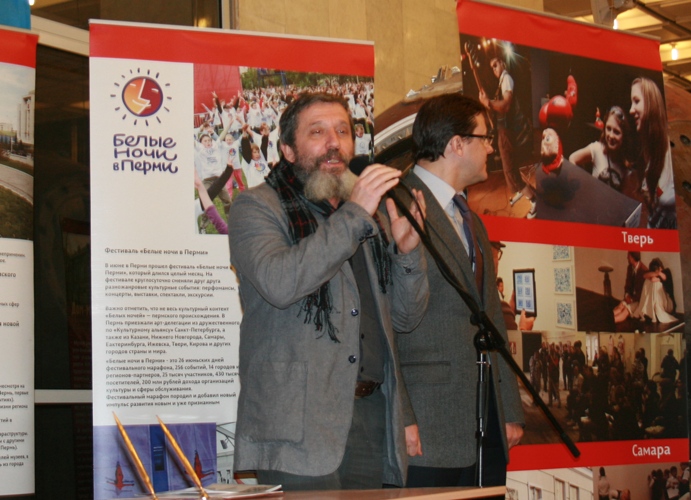 А перед открытием наш мэр Дмитрий Азаров и вице-премьер правительства Пермского края Борис Мильграм подписали договор о вступлении города Самары в проект "Культурный Альянс". |