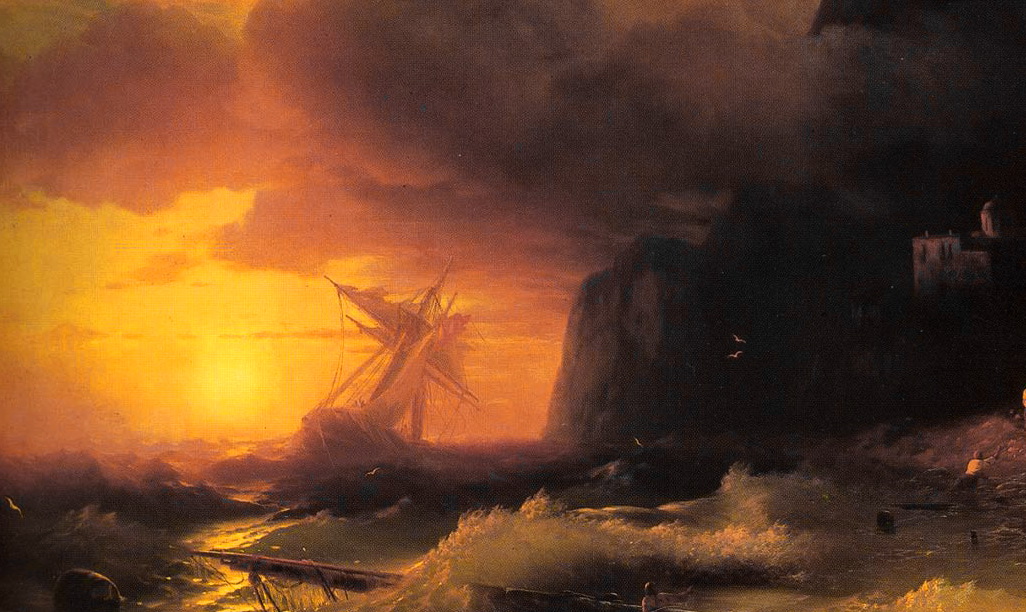 Мне видится перепевка картины Айвазовского Кораблекрушение у Афонской горы 1856г., 97х148. Небо посветлее и деталей поменьше.