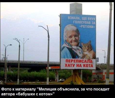 Предполагаемый автор билборда «Взнала, що внук голосував за “регіони” — переписала хату на кота» Максим Голосной объявлен в розыск по делу о растрате имущества Елизаветовского сельсовета, что никак не связано с политической рекламой. Об этом «Комментариям» сообщили в Днепропетровском управлении милиции. По информации правоохранителей, уголовное дело по факту присвоения и растраты имущества Елизаветовской сельсовета Петриковского района было возбуждено 21 ноября 2011 года. 26 июля того же года состав преступления в уголовном деле был переквалифицирован и в отношении бывшего председателя указанного сельсовета Голосного было возбуждено уголовное дело по ч. 1 ст. 191 (присвоение, растрата имущества или завладение им путем злоупотребления служебным положением) Уголовного кодекса Украины. Следователем было вынесено постановление о привлечении его в качестве обвиняемого. В связи с тем, что местонахождение Голосного не было установлено, 27 июля 2012 года он был объявлен в розыск. Как сообщали «Комментарии», билборд «Взнала, що внук голосував за “регіони”» стал хитом интернета. Автором данного плаката называют экс-главу сельского совета Елизаветовки Макисма Голосного, который баллотируется в Верховную Раду по мажоритарному округу. Сам Голосной накануне заявил, что его объявили в розыск, однако до сих пор не предъявили обвинение и поэтому розыск не является законным. |