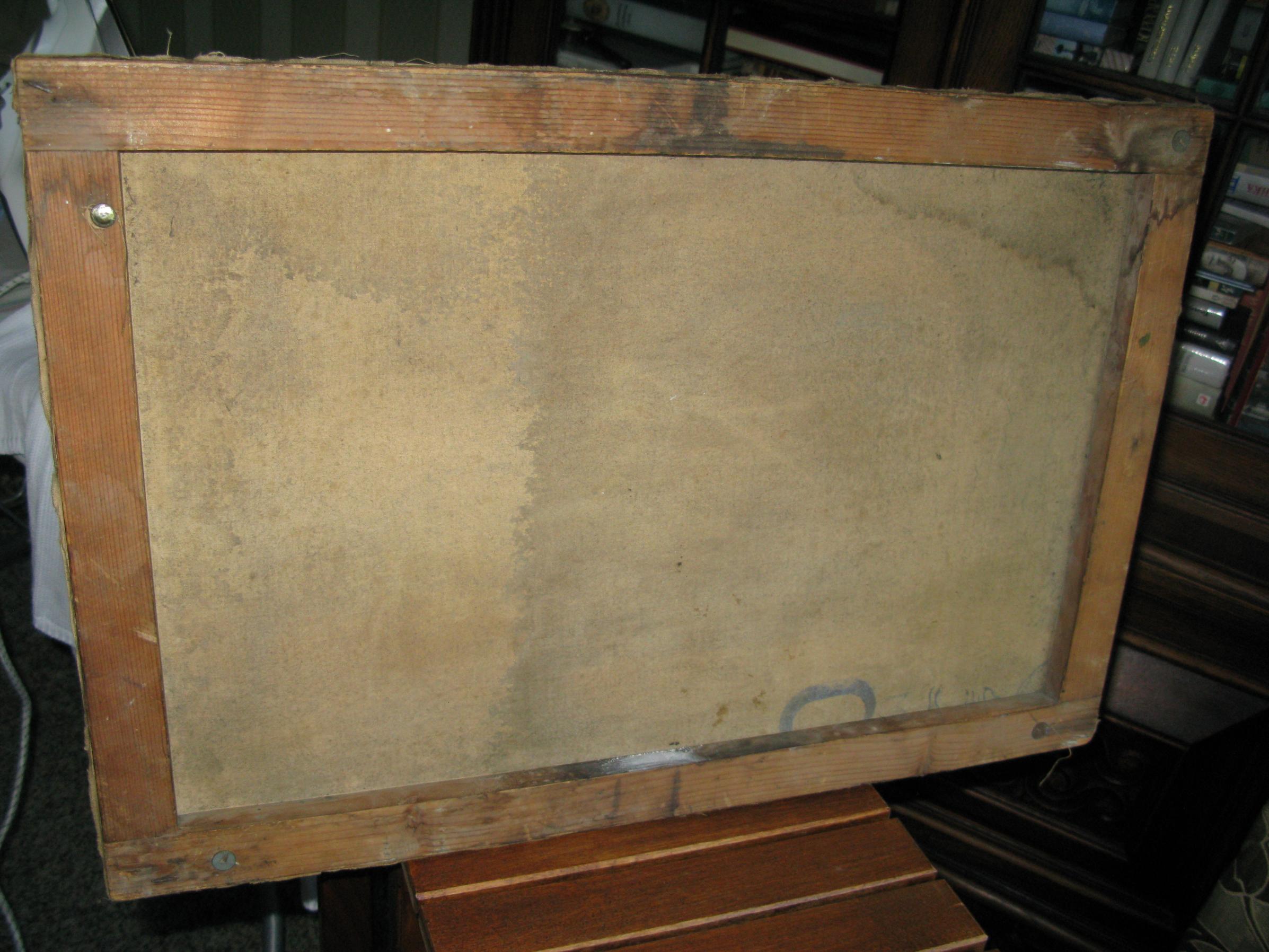 Я тоже полюбила эту картину и очень хочу что-то узнать про автора. Картинка старая. Очень загрязнена. Холст очень тонкий, но прочный. Гвоздики старые. Подписи не обнаруживается. На обратной стороне в нижнем правом углу на холсте какие-то синие разводы, но на подпись вробе бы не похоже. красочный слой очень тонкий. Я конечно, не специалист, но не похоже, что это масло. М.б. темпера. Очень жду отклика! |