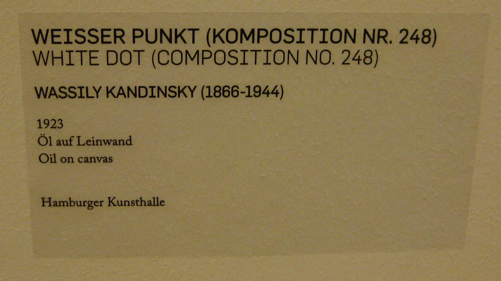 Интересуют обыкновенные чувства от восприятия. Эта работа из местного музея, Кунстхалле в Гамбурге. Водил по музею гостей, подходим к этой работе, гордо оглашаю, вот вам... Кандян. Народ рассматривает и обращается с ехидцей ко мне... и шош тут нарисовано? По опыту знаю, щеки надувать нет смысла и имею дежурный ответ, - эх ничего мы не понимаете.... ![]() Вот табличка к этой работе: |