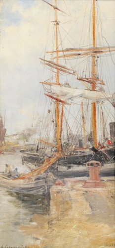 Alexis Petrovich BOGOLIOUBOV (1824 - 1896) BATEAUX A QUAI AU PORT DU HAVRE Huile sur toile signée en cyrillique en bas à gauche, située en bas à droite Hauteur : 38 Largeur : 18,50 cm Provenance : Collection particulière, France A l'actuel propriétaire par cessions successives Estimation 30 000 - 40 000 € Характерный пример трудности определения подлинности картины. Влияние французских маринистов современников на А.П.Боголюбова таково, что его работы стилистически практически неотличимы от произведений французских художников соотносимых с ним по живописному таланту. Работал он теми же красками и на тех же холстах, что и французы. Для определения подлинности остаются лишь косвенные признаки. У кого-либо есть какие-нибудь соображения? |