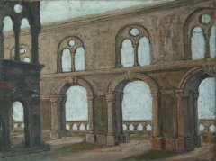 11. Design sketch, 1950, 43 * 30 (1800) 12. Motif scenery; 1943. 42 * 29 (700) 13. Kazakh cemetery; 1942. 30 * 25 (2000) 14. Old Minsk, 1973. 20 * 28 (1000) 15. Set design, 1940-e, 44 * 29 (1500) 16. 32 * 42 (800) 17. (500) 18. (400) 19. (500) |
