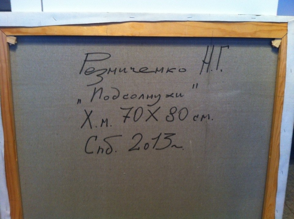 Николай Резниченко, Подсолнухи, 2013 г., холст/масло, 70 х 80 см. Родился в 1958г в Саратовской области поселок Ершов. По окончании школы г. Славянска на Кубани, поступает в мореходное училище г. Керчи, за этим последовала служба в армии (г. Киев), далее учеба в художественной школе г. Краснодара. В Костомукше (Карелия), где Николай жил с 1982г., он работал на стройке, позже преподавал живопись и графику в художественном кружке не на миг не прырывая быть художником. Там же в Карелии (1986г.) состоялась первая большая выставка, ее успех определил участие работ художника во многих последующих экспозициях, большое влияние на его живопись оказала практика реставрации икон. С 1989 живёт и работает в Петербурге.