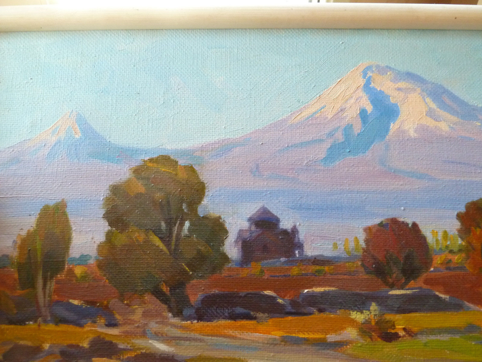 Род. 13.6.1925 (Вагаршапат). Член Союза художников СССР. Заслуженный художник РА (АрмССР) (1983). Окончил Ереванский институт театра и кино (1953), с 1963 года преподает в Ереванском государственном архитектурно-строительном университете (в 1975-91 гг. заведующий кафедрой). К его знаменательным работам относится «Дантова легенда» (по мотивам Чаренца, серия картин), «Лилит», «Ананда и смерть» (по мотивам Исаакяна), «Мой народ», «Мечта» (литография). Создавал также живописные тематические-композиционные работы, пейзажи, натюрморты, портреты («Осень», «Полдень», «Саят-Нова» и др.), проиллюстрировал более 200 книг. 43см x 23см Холст, масло 1980 Армения Пейзаж с видом на Арарат. Эджмиацин. Последний раз редактировалось HOLMES; 07.05.2015 в 09:02. |