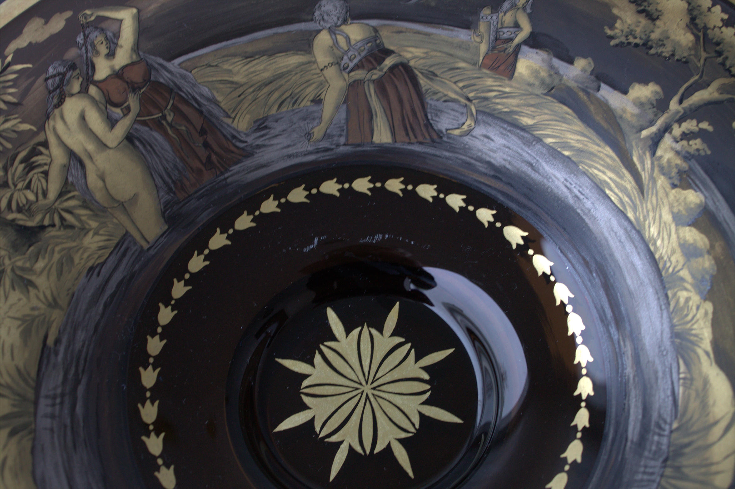 Блюдо произведено в 1920 году,коричневое стекло отделанное золотом и эмалью.На блюде изображены аллегорические,мифологические сцены в лунном свете, вода ,пейзаж.В центре золотая резетка,по краю золотой ободок.Состояние очень хорошее,имеется одна незначительная царапина. Диаметр 31 см.(см фото) Цена 30 тыс руб с доставкой.Рассмотрю встречные предложения по цене.