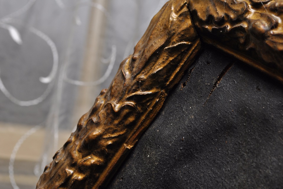 Рамка полностью из дерева(резьба) и покрыта краской с лаком.Сзади есть порез заклеенный бумагой. |