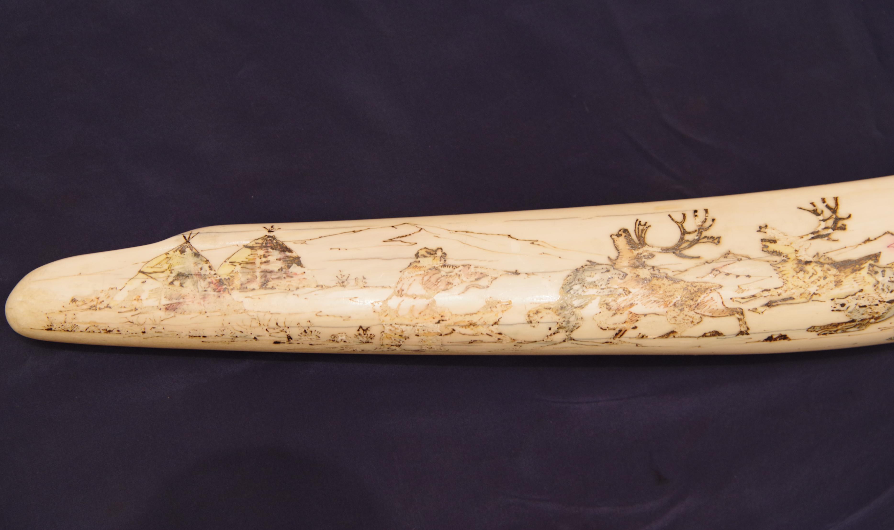 Винтажный чукотский сувенир - клык моржа, расписанный чукотским народным художником сценами северного быта. СССР, Чукотка, б/х Провидения, 1982 г.