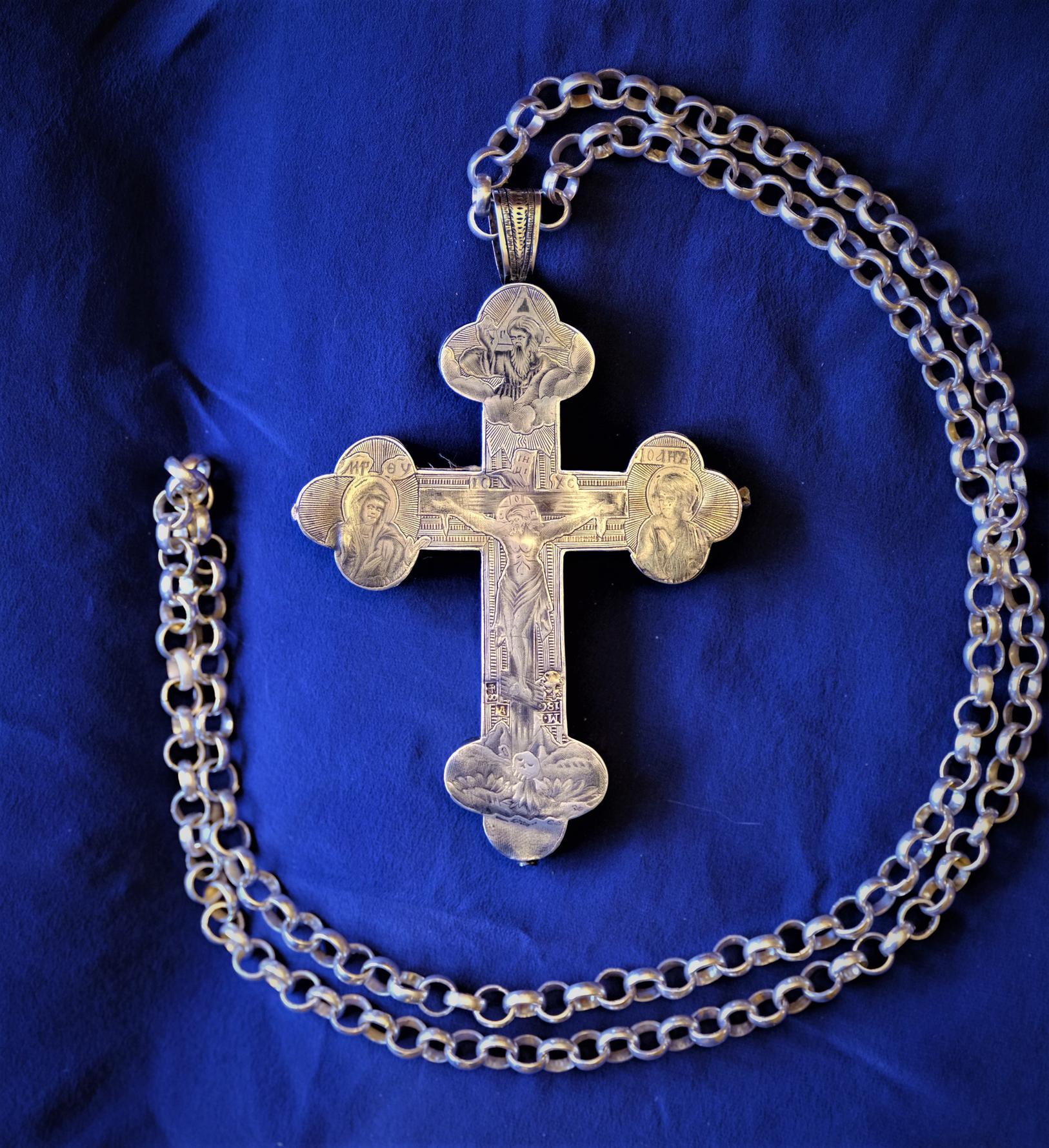 Материалы: серебро «84» пробы, позолота, северная чернь. Техническое исполнение: литье, позолота, чернение, ручная гравировка штихилем, канфарение, шлифовка, доводка, монтировка. Крест имеет толстую якорную цепь из серебра «88» пробы. Размеры: Высота - 15 см. Ширина – 10 см. Толщина – 0,7 см. Вес креста - 110 граммов. Длина цепи - 112 см. Вес цепи – 150 граммов. Общий вес серебра – 260 граммов. Окончания креста выполнены в форме трехлистника. В центре изображение сцены Распятия Христова, окруженное миниатюрными фигурами Богоматери и Иоанна Богослова. Изображение Господа Саваофа в облаках вверху, Голгофы с черепом Адама внизу. Клейма: «84» пробы, городское клеймо г.Москвы, пробирного мастера «М.К» (пробирер* Карпинский Михаил Михайлович) над датой «1802», именник мастера-монограммиста «неразб.А». Изысканная работа высочайшего художественного уровня. В отличном коллекционном состоянии. Музейный уровень! Незначительные следы бытования. Внутри креста находится вата с неизвестной субстанцией коричневого цвета (св.мощами?). * Клеймо пробирного мастера Москвы - Карпинский Михаил Михайлович - инициалы "М-К" - 1800-1824 гг. Карпинский Михаил Михайлович, в верхней части клейма пробирного мастера изображены инициалы "М" и "К", между букв стоит точка, по середине клейма проходит разделяющая черта, в нижней части клейма указан год "1802". (1800-1824 гг.). Цена договорная. Все вопросы и запрос доп.фото пожалуйста адресуйте на эл.почту: arzwien@gmail.com |