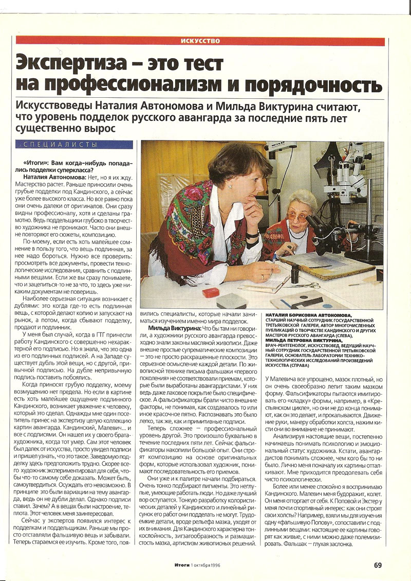 Неизвестно, чего здесь больше - профессионального снобизма, беспокойства за ”честь мундира” или подсознательного нежелания расстроить выгодные торги. Важно одно - в области авангарда не существует четко устоявшейся методики экспертизы.