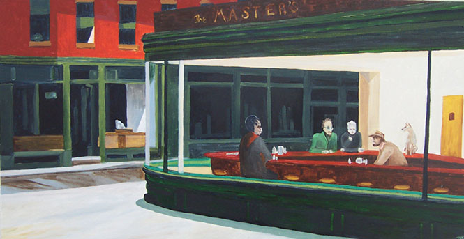 Встретил в сети Интернет не менее пятидесяти пародий на картину Эдварда Хоппера Nighthawks. Некоторые забавные, некоторые странные, есть и актуальные.
