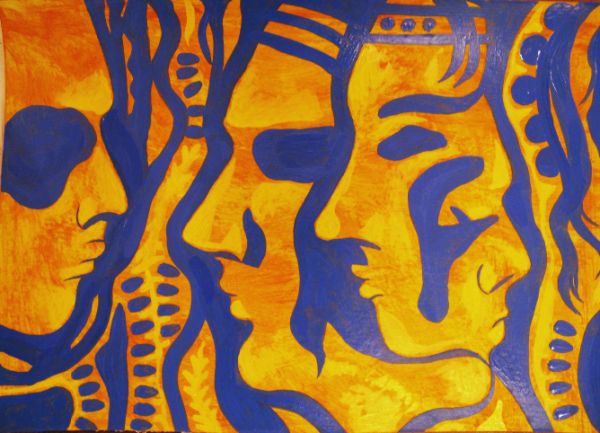 С солнцем у меня получаются величественные работы. Опять символ - жизни? 1.Поцелуй. Считаю своей лучшей работой. Цвет не очень передался, работа чуть темнее. Конечно, чуть есть от Пикассо с его великанами и великаншами, чуть от Мунка с Криком, но в целом все раскалилось и сплавилось. Точнее, Прощание, ведь есть одинокая фигура на дороге под солнцем. 2.Девушка и солнце. 3.После дождя. 4.Двое. |