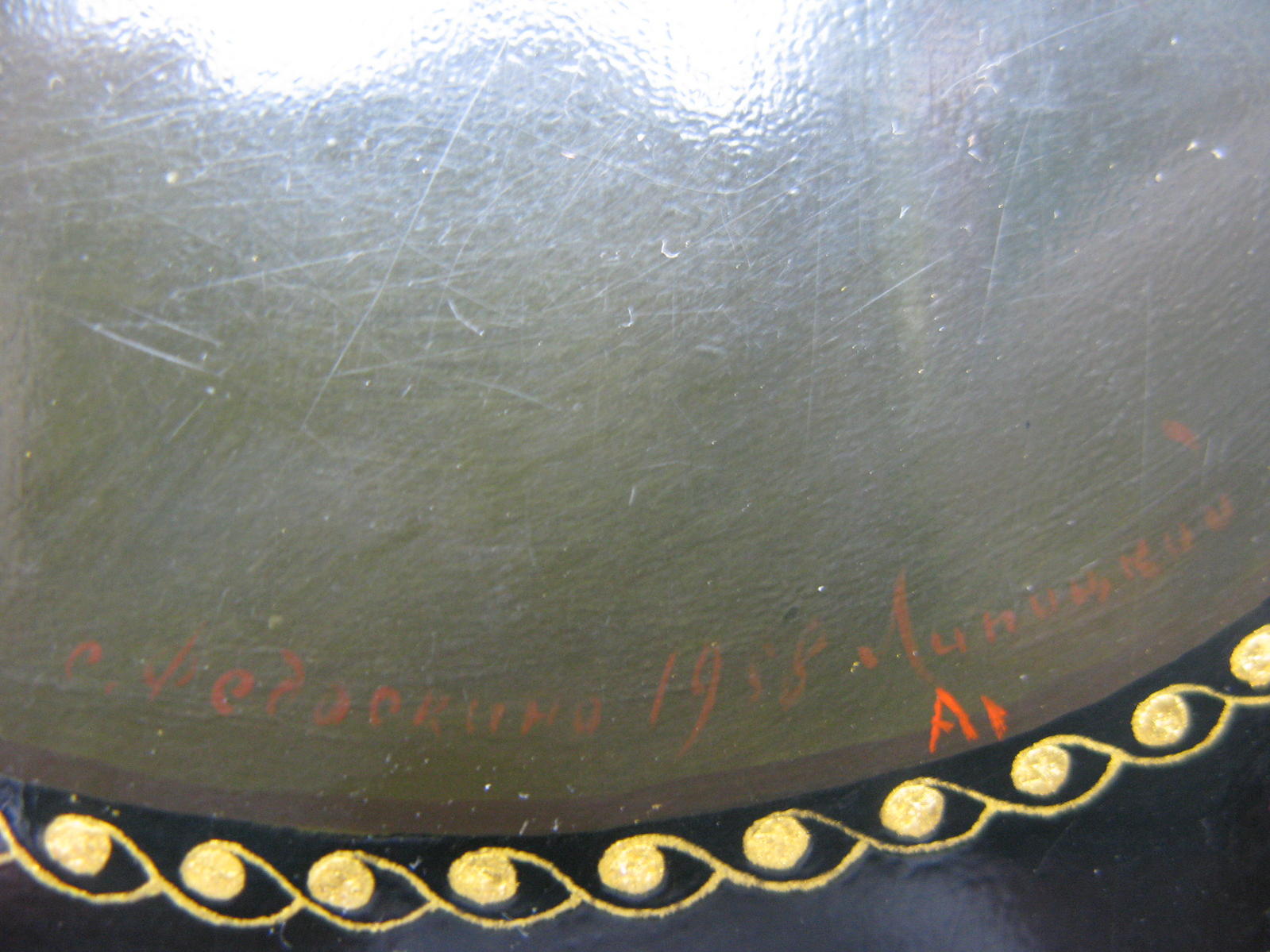 Шкатулку, пр-во. Федоскино с портретом П. И. Чайковского. Авт. Липицкий(не разборчиво), 1958г. Состояние отличное, углы все целые. Есть вмятина в нижний левый угол, без потери краски и лака. Хорошее исполнение портрета. подробнее здесь: https://picasaweb.google.com/tunnelk...ISpuY6Pz9ixtAE Последний раз редактировалось tunnel; 14.11.2012 в 00:22. |