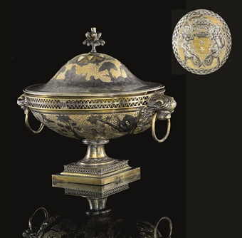 Oval, on a pedestal foot and stepped square base with pierced border, the body applied with two lion-mask ring handles, one side nielloed with a lord and lady, the other with mythological figures within landscapes, on a chased scalloped gilt ground, beneath a pierced rim; with a gilt liner; the domed cover nielloed with allegorical figures in a landscape on a chased scalloped gilt ground, one side centering the coat-of-arms of Count Sheremetev, all beneath festoons and floral garlands and a rim chased with a laurel wreath, with a flower finial, fully marked, the base further scratch engraved beneath with inventory number 'H7 no' and weight 7 [funt] 58 [zolotniks] (which approximates to 100 troy ounces)