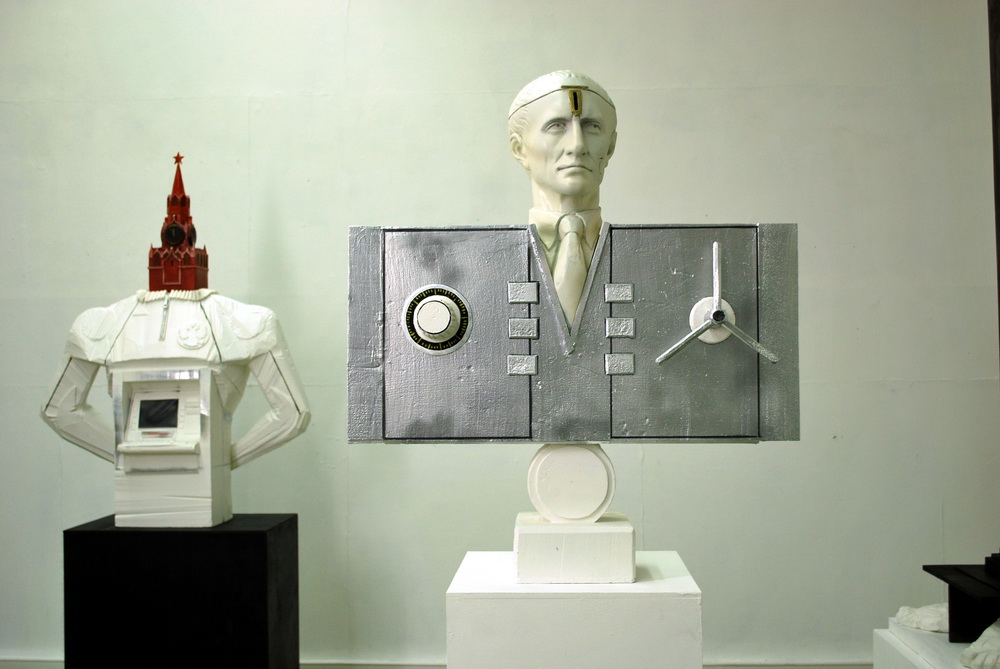 На выставке Remix в Галерее XL представлены работы, сделанные в соавторстве «имперским художником» шестидесятником Борисом Орловым и художником поколения двухтысячных «Поролоном» Сергеем Шеховцовым. Редкий и очень правильный дуэт. Синергия двух поколений, продуктом которых стали очень точные метафоры. Вот этот тотем в пиджаке мыслями весь в лондоне – ну разве не символ уходящего времени? А играющий мускулами банкомат-Кремль? Токи социума. Ну правда здорово?