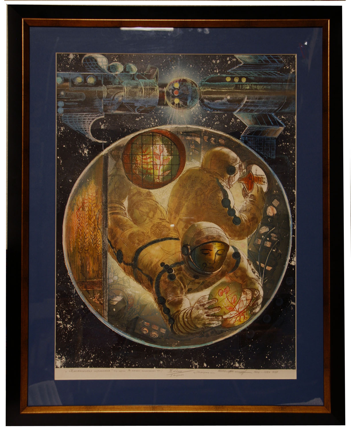 Прекрасная, качественная графика художника одинадцатой пятилетки. Цветной афорт Размер с рамой примерно 88 х 68 см. Родился в 1942 году в деревне Поселихино Костромской облаcти. С 1956 по 1960 год учился в Палехском художественном училище. С 1960 по 1965 продолжал учебу в Горьковском художественом училище по академической программе художественного института им. Сурикова С 1978 года является членом Союза художников СССР. В каких собраниях работы Работы находятся в Министерстве культуры РСФСР, Мемориальном музее космонавтики, в центре искусств имени Помпиду во Франции, в Вашингтонской галерее в США, в частных коллекциях за рубежом. Участие в выставках, аукционах 1979 Биенале в ФРГ; 1979 Выставка в Берлине; 1979 Выставка в Болгарии; 1980 Выставка в Польше; 1980 Выставка в Чехословакии; 1981 Лауреат ВДНХ СССР (бронзовая медаль за серию "В начале косической эры"); 1982 Выставка живописи и графики в Париже; 1983 Выставка "Советская графика" в Париже; 1989 Выставка в Белграде (Югославия). Библиография Каталог международной художественной выставки "Время - пространство - человек". Москва, 1980; Каталог выставки "В стране Советов". Москва, 1981; Каталог художественной выставки, посвященной 20 - летию первого полета человека в космос. Москва, 1981; Каталог выставки в Международном центре искусств имени Помпиду. Париж, Франция, 1982; Техника - молодежи.1982, N 9; Захарченко В. На перегонки со временем, или мир принципиально возможных чудес. Москва, 1982; Культура и жизнь, 1983, N 10; Губарев В."Мечта Гагарина". Литературная газета, 1983, N 15; Образ времени - художники одинадцатой пятилетке. Москва, 1985; Мирный космос. 1986; Памятные общественно - политические и художественные даты. 1986; Space, США, 1989; Каталог - буклет "Родники России". Можайск, 1992; Анатолий Веселов, Галина Веселова. "Родники России". Москва, 1992. ФИЛЬМЫ: "Свободный полет в цвете, реж. И.Сарахатунова. Москва, 1993; "Россия - другая Европа". Швеция, 1995.