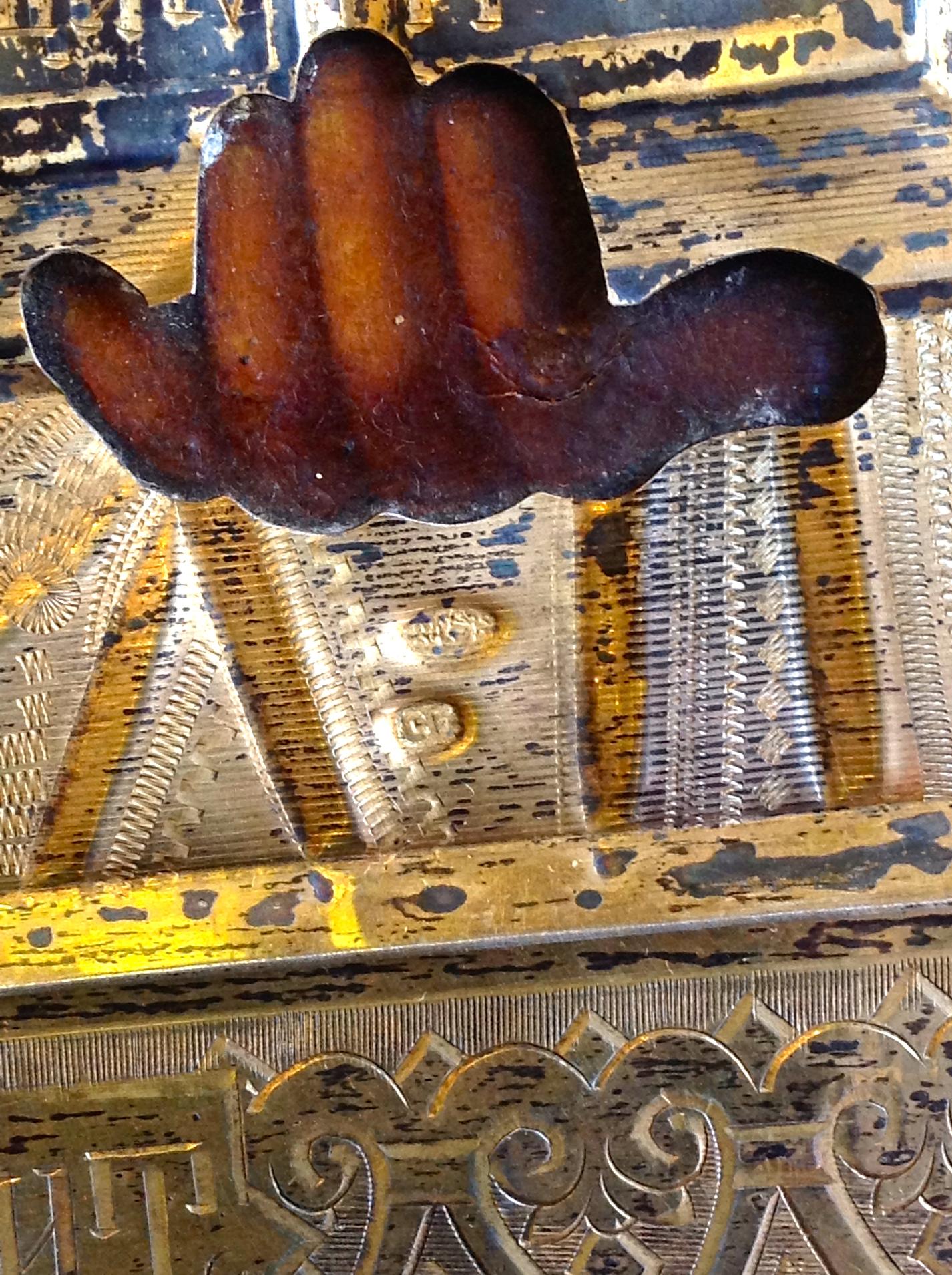 Клейма: овальное клеймо Московского окружного пробирного управления (1896-1908); пробы серебра «84»; знак государственного удостоверения «женская головка в кокошнике, повернутая влево», мастера «С Г» (Семен Григорьевич Галкин).