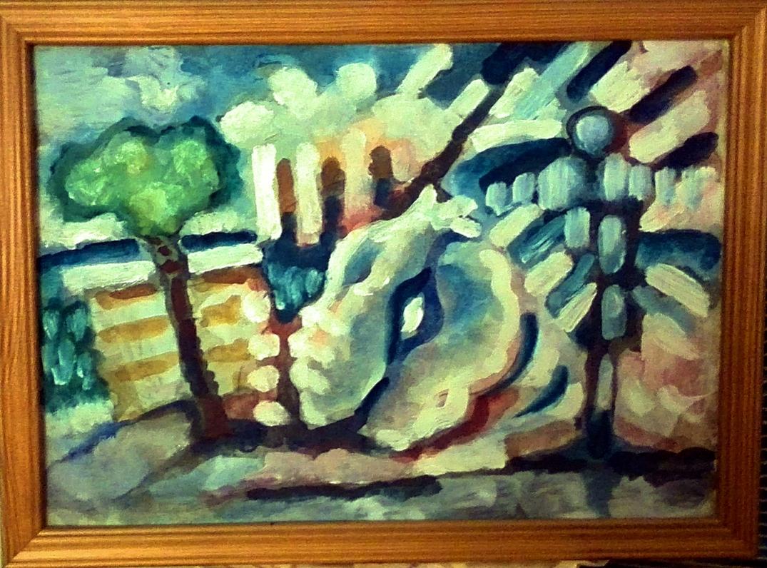 Здравствуйте! Имеется графическая картина. Художник Гогуадзе Альберт Иосифович. Без названия. Даты нет. Акв./гуашь, бумага для рисования формата А4. Сзади карандашом - имя фамилия и подпись автора. Вставлена в легкую рамку. На фото белое немного шумит, утрачены некоторые полутона, т.е. вживую картинка симпатичнее выглядит.