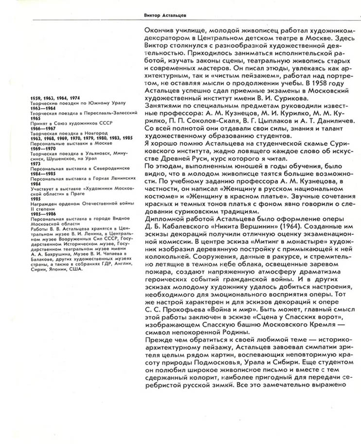 Михаил Владимирович Алпатов как историк искусства, профессор Московского художественного института им. В. И. Сурикова активно интересовался работами своего ученика В.В. Астальцева ещё с институтских времен и статью в альбоме В.В. Астальцева, выпущенном в 1988 году издательством "Советский художник", написал именно он. Это практически единственный труд великого искусствоведа (крайне искорёженный цензурой), посвящённый русскому художнику советского периода. Задумывал М.В.Алпатов эту работу как большой альбом с более чем сотней иллюстраций (о чём свидетельствует его письмо, хранящееся в архиве дочери Виктора Владимировича), но тема русской истории и русского пейзажа в то время показалась издателю не актуальной. Я решил отсканировать этот альбом и поделиться с форумчанами изображениями репродукций потрясающих работ Виктора Владимировича Астальцева. Надеюсь Вам понравится и будет интересно узнать Ваши мнения о работах этого замечательного и незаслуженно забытого и очень рано ушедшего мастера! Еще изображения его работ я нашел здесь: http://astalcev.ru/ |
