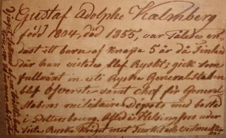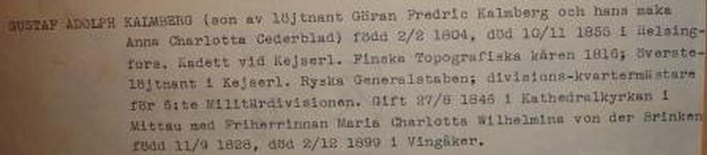 Your Kalmsberg Gustav Adolf, the son of Lieutenant Göran Fredrik Kalmsberga and his wife Anne, Charlotte Sederblad, was born 2.02.1804 and died 10.11.1855 in Helsinki. A description of a military career. 28/08/1845 married Mary Charlotte Wilhelmina von der Brinkenfedd (11.09.1928-2.12.1899) in the Cathedral Mittal (no idea where it is). I enlarge the image. |