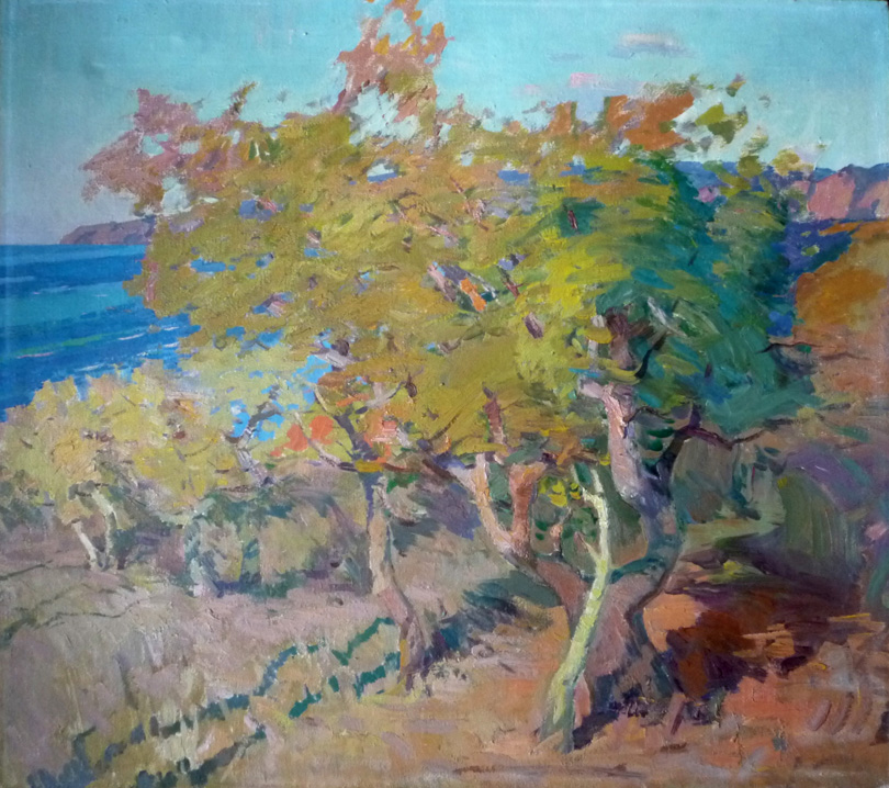 К большому сожалению, творческий потенциал художника так и не был до конца реализован. Причин здесь можно назвать несколько. Это и провинциальность города, где художник вырос и работал и где основное внимание государство уделяло промышленному развитию. Где художники пробивали себе дорогу на творческий "Олимп" без должной поддержки городских властей, зато через строгое "сито" областных и республиканских цензоров от культуры. Где предпочтение отдавалось художникам, пропагандирующим коммунистический образ жизни. Те, кто не вписывался в рамки, установленные партийными начальниками от культуры, зачастую оставались в тени. Также много времени уходило на различные оформительские работы к праздникам и юбилеям. Несмотря на все это художник с успехом принял участие в нескольких республиканских выставках рядом с живыми классиками украинского искусства, такими как Н.П. Глущенко, В.Н. Костецкий, А.А. Коцка, А.М. Лопухов и др. И вдруг, как гром среди ясного неба,прозвучал отказ Президиума правления СХ Украинской ССР в приеме в члены СХ. Интересна своей нелепостью формулировка: "представленные фотографии работ не дают полного представления о творческом лице художника". ...Последнее десятилетие жизни художника прошло под знаком "зеленого змия". Несмотря на все жизненные перипетии Леонид Гади оставил нам правдивые и искренние произведения о своем времени, продолжив лучшие традиции русской и украинской пейзажной живописи. |