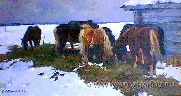 Вот этюд и фрагменты. Первый фрагмент - это не лошадь ,это горный сайгак (поясничный отдел подпрыгнул до смешного. Второй фрагмент (я думаю лошадка списана с картины Стожарова "Приезд на слёт колхозников-передовиков"). Только на картине она стоит ровно и спинка у неё ровная, а на этюде она падает. На втором фрагменте я её развернул немного чтоб не упала вперед, теперь она стоит, но передние ноги стали длиннее, чем задние. На всех работах Стожарова с анатомией все в порядке, он был профессионал. И поясничный отдел как и лопаточный находятся на одном уровне. О живописи разговор долгий. Но как вы видите на представленном этюде передний план процарапан обратной стороной кисти (типа травинки), когда у Стожарова передний план наоборот всегда пастозный или сделан просто легко в виде подмалевка средним или большим размером кисти. Нет не Стожаров.