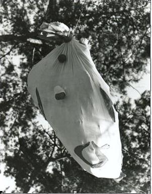 Sadamasa Motonaga: hanging on the branches of pine, plastic bags filled with colored water, using smoke to which he attaches a rounded shape with the help of special machines