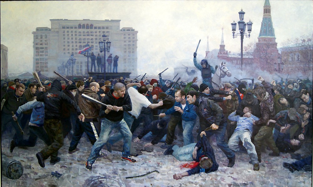 Я же не автор, вижу тоже что и Вы. Рассматривайте, но не думаю, что там какие-то аутентичные знаки, изображена не битва конкретных каких-то социальных, политических или национальных групп. На картине даже расположение полос российского флага перепутаны.