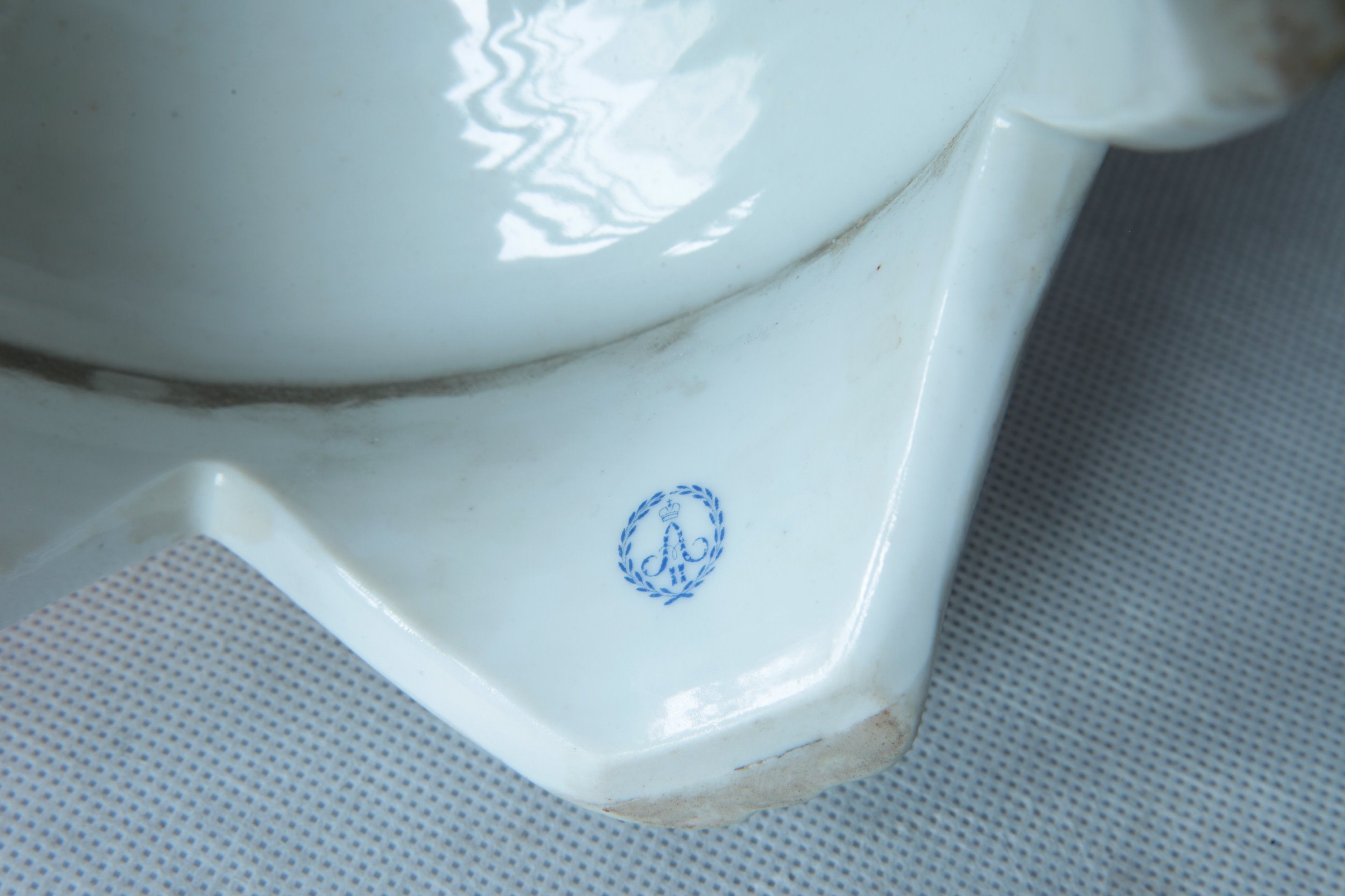 Настольная лампа. Императорский фарфор. Период Александра II. Лампа с ручками, лепными барельефами, со стеклянным резервуаром для керосина, с цветочной росписью. Металл, фарфор, роспись надглазурная полихромная, позолота; красное стекло, выдувание, роспись эмалями, позолота. Императорский фарфоровый завод, Императорский стеклянный завод, 1870-е гг. h = 50 см; Марка: А-II под императорской короной, синяя, надглазурная. Предмет требует реставрации, из значительных утрат – сколот один завиток на фарфоровой ножке (на первом фото на переднем плане прямо по центру), капитальной реставрации требует абажур. Автором данной формы при проведении экспертиз аналогичных работ был признан Шпис А. К., в данном случае клеймо и сам предмет у специалистов не вызывает сомнений в подлинности. |