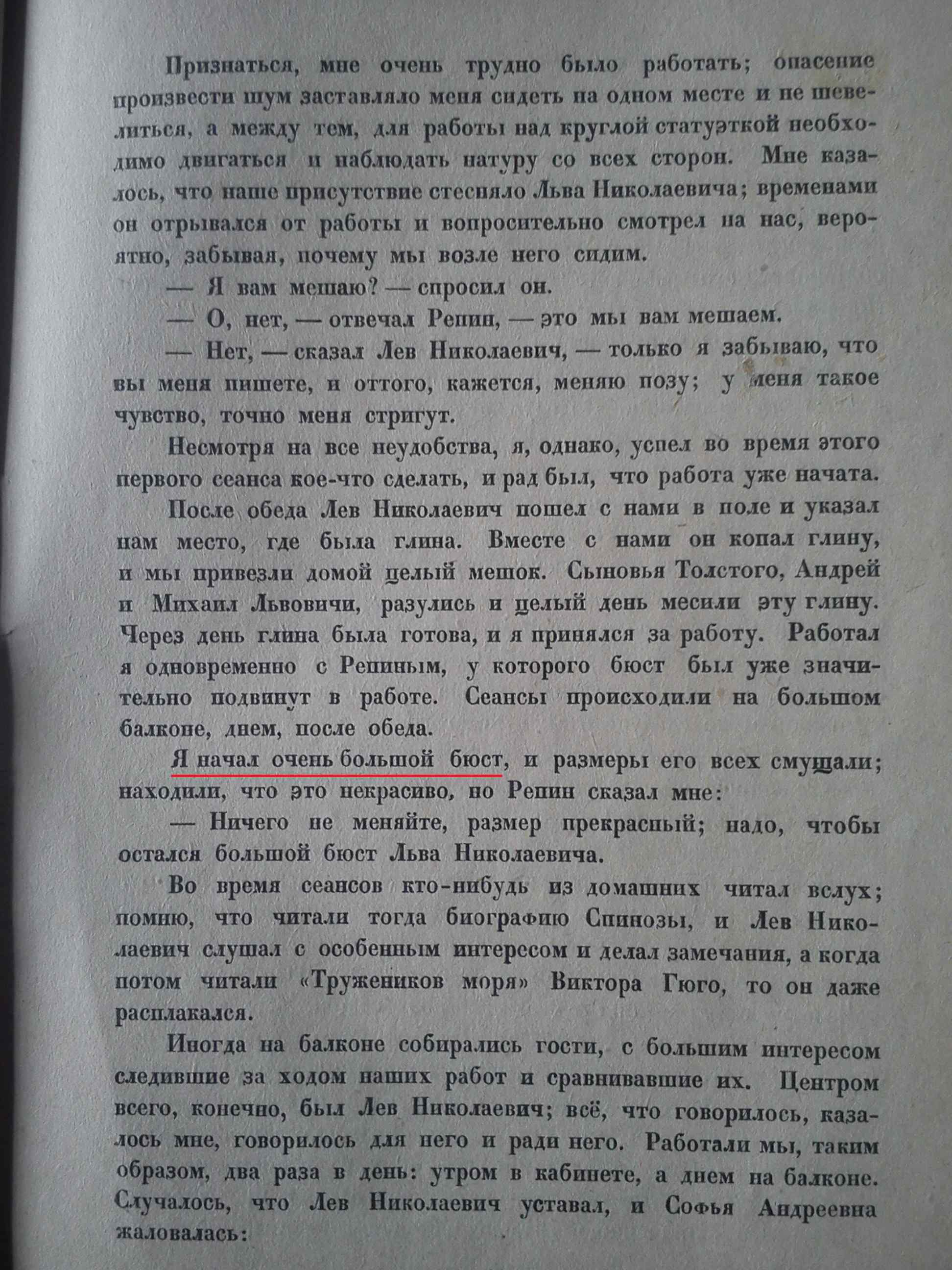 Наши предположительные данные по имеющимся скульптурам:  1. Мрамор, 19 век, Библейский сюжет «Ребекка у колодца». (Как мы понимаем, колодец с водой символизирует источник жизни. Служение, которое выполняет девушка - несет эту воду людям - должно вдохновлять на служение обществу. Скорее всего данное произведение искусства предназначалось для значительных общественных деятелей.) Дворцовый предмет. Высота 125 см, постамент 100 см. В местах подписи – сколы и врезки (подпись утрачена предположительно при перемещениях в революционные или военные времена). Имеются данные о наличии в прошлом подписи, схожей с фамилией Забелло. По свидетельствам специалистов исполнение скульптуры имеет значительное сходство с работами известного русского скульптора Пармена Петровича Забелло (скульптуры которого имеются в Русском Музее Спб и других известных музеях страны). 2. Бюст Л. Н. Толстого. Абсолютно уникальная работа академика Ильи Гинцбурга. По воспоминаниям автора работа делалась с натуры в Ясной Поляне (это единственная из трех авторских скульптур Толстого, сделанная Гинцбургом с натуры, остальные две делались им по фотографиям и эскизам), при этом Лев Николаевич позировал одновременно Гинцбургу и Репину (что подтверждается прилагаемыми к данной работе воспоминаниями автора). Первый слепок, гипс, подпись латиницей «Elya Ginzbourg», «Tolstoi», кириллицей «Ясная Поляна», «1891». Высота 75 см, 1891 год. 3. Д. И. Менделеев, гипс, высота 32см. Подпись "Худож отлив Д.М. Бройдо, СПБ". Точно такая же (таких же размеров и тоже в гипсе) найдена в каталоге Русского Музея в СПБ работы Гинцбурга. 4. Максим Горький, гипс, высота 65 см. Подписи нет. По пластике имеется сходство с работами И. Гинцбурга. 5. Кузнец, шпиатр, высота 58 см. Подпись латиницей "FORGERON". Западная Европа, 19 век, предположительно Франция. |