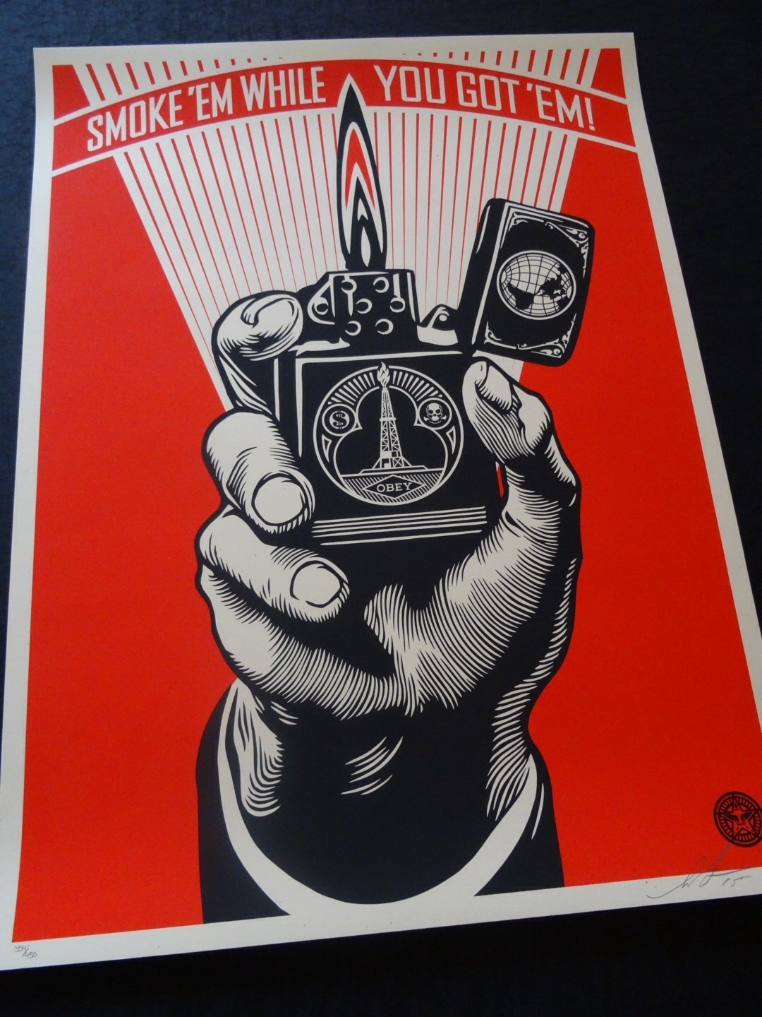 Smoke’em while you Got’em Размер 60,96х45,72 см. Техника – Шелкография Лимитированный тираж 450 экземпляров Экземпляр №354 Подписан и пронумерован художником 18 x 24 inches Signed and Numbered Limited Edition of 450 Цена - 15000руб. Есть ещё много работ этого автора! Обращайтесь. Shepard Fairey Фейри Шепард (Frank Shepard Fairey, так же известен как Obey) – художник, дизайнер и иллюстратор, родился в 1970 году в Калифорнии. В подростковом возрасте он увлекается скейтбордингом, панк-роком и DIY-искусством. Его художественное творчество началось с рисования на футболках и скейтбордах товарищей. Фейри наиболее известен благодаря двум работам в стиле поп-арт, обыгрывающим раскрученные медиа-образы. Первая, созданная в 1986 и известная в двух вариантах, представляла собой портрет французского борца Андре «Великана» Руссимоффа («Andrе the Giant Has a Posse», а позже движение «Obey giant»). Основной целью этих движений являлось распространение различных наклеек на улицах городов с целью привлечь внимание к молодежным культурам, которые начинали зарождаться в то время. Под борцом красовалась фраза «GIANT HAS A POSSE» (У Великана есть толпа), во втором варианте сокращённая до слова «OBEY» (Повинуйся), связанного с фильмом «Они живут среди нас» и ставшего творческим псевдонимом художника. После окончания школы дизайна в 1992 году он работал в качестве графического дизайнера в различных компаниях, а в 2002 году создал свое дизайнерское агентство «Studio number one». В 2004 году Шепард начал еще одно движение - против президента Буша и войны в Ираке. Основными слоганами наклеек, которые распространял Шепард, были: “Make art, not war”, “Be the revolution”. В 2006 году Шепард Фейри выпустил свою книгу «Obey – Supply and Demand», в которой можно найти очень большое количество различных материалов, рассказывающих о его творчестве и о движениях, которые он поддерживает. Сейчас он продолжает свою работу в качестве дизайнера, занимается разработкой различных наклеек, сотрудничает с такими группами, как: Interpol, Black Eyed Peas, в качестве дизайнера различной рекламной продукции этих групп, а также занимается оформлением обложек для их альбомов. Самая же знаменитая картина Фейри - работа «Hope» (Надежда), которая посвящена президенту США Бараку Обаме. Фейри выполнил её в 2008, во время предвыборной кампании Обамы. Автор некоторое время колебался между несколькими вариантами подписи, но в конце концов остановился на «Надежде». Плакат не только прославил своего создателя, но и повлиял на настроения избирателей. Мотивы «Надежды» использовались при создании политических плакатов и после выборов. Кроме этих двух картин, Фейри принадлежит ряд художественных плакатов, посвящённых социализму, религии, музыке и экологии. Ныне Фейри признанный талант, связанный как с андеграундом, так и с массовой культурой. Его произведения хранятся в Музее современного искусства и Смитсоновском институте. Последний раз редактировалось Sanchester; 03.07.2015 в 14:07. |