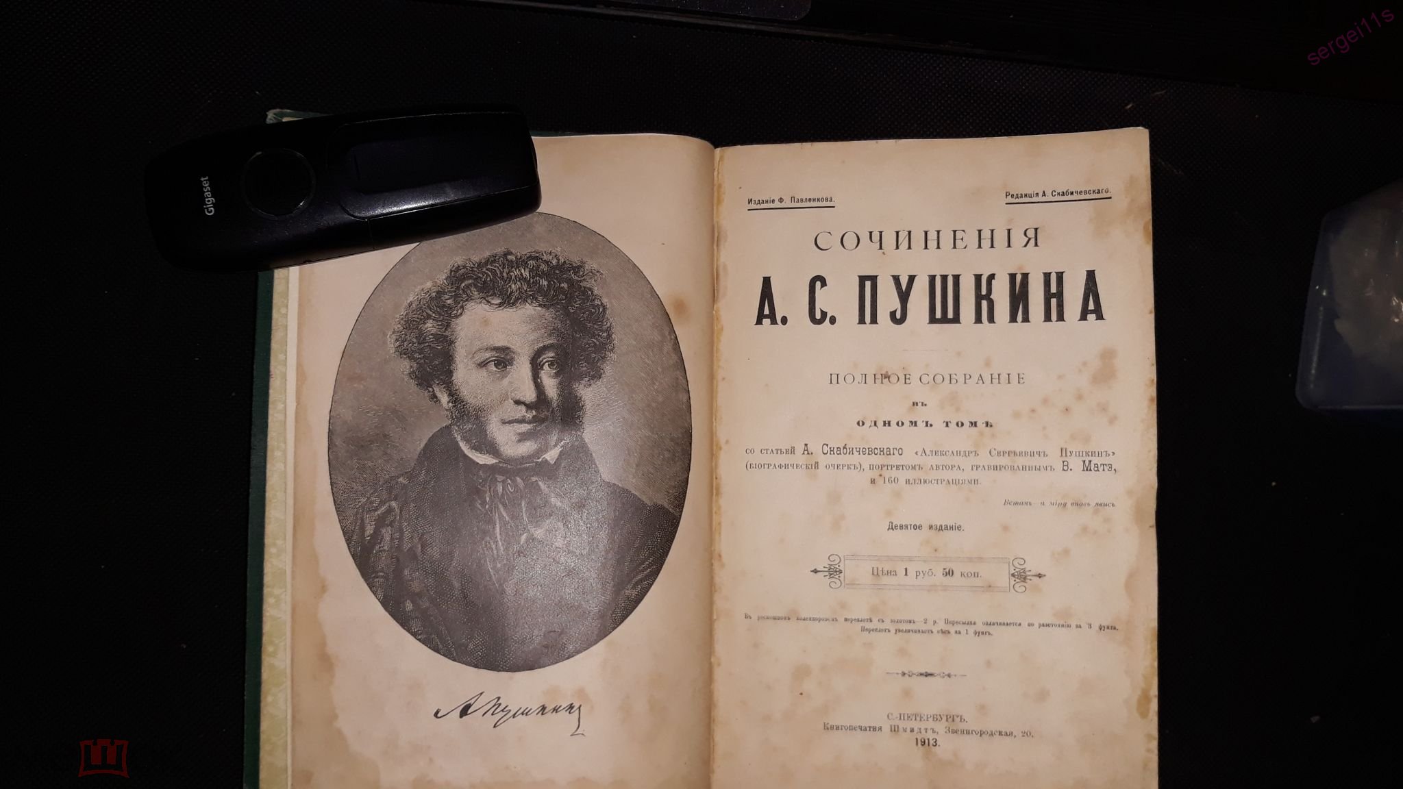 Довольно редкое издание! Полное собрание сочинений А.С.Пушкина в одном томе 1913 1738 стр. [Издание со 160 иллюстрациями] Сочинения А.С.Пушкина. Полное собрание в одном томе. Со статьей А.Скабичевского, портретом автора, гравированным В.Матэ, и 160 иллюстрациями. потертости корешка и обложки стр все на месте. вес больше2кг 10000руб
