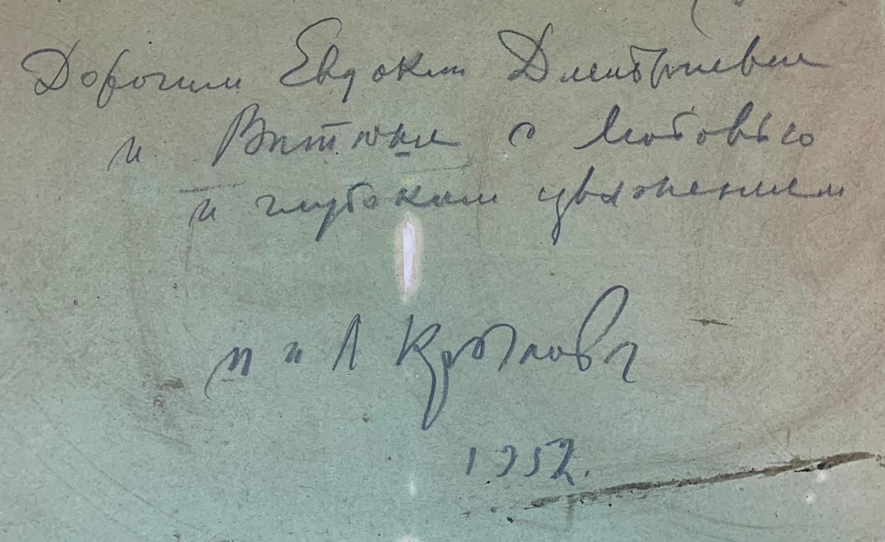 Холст на картоне, под стеклом. 41,5 х 56 см. 1951 г. На лицевой стороне подпись "П.Крылов. 1951 г. сентябрь" На оборотной стороне - дарственная подпись "Дорогим Евдокии Дмитриевне и Витюше с любовью и глубоким уважением. П и Л Крыловы. 1952 г." Экспертного заключения нет. Готов получить его по требованию покупателя. Из семьи наследников тех, кому дарились. Цена - 250000 руб. Любые дополнительные фотографии - по запросу. На момент продажи - картины в Москве |