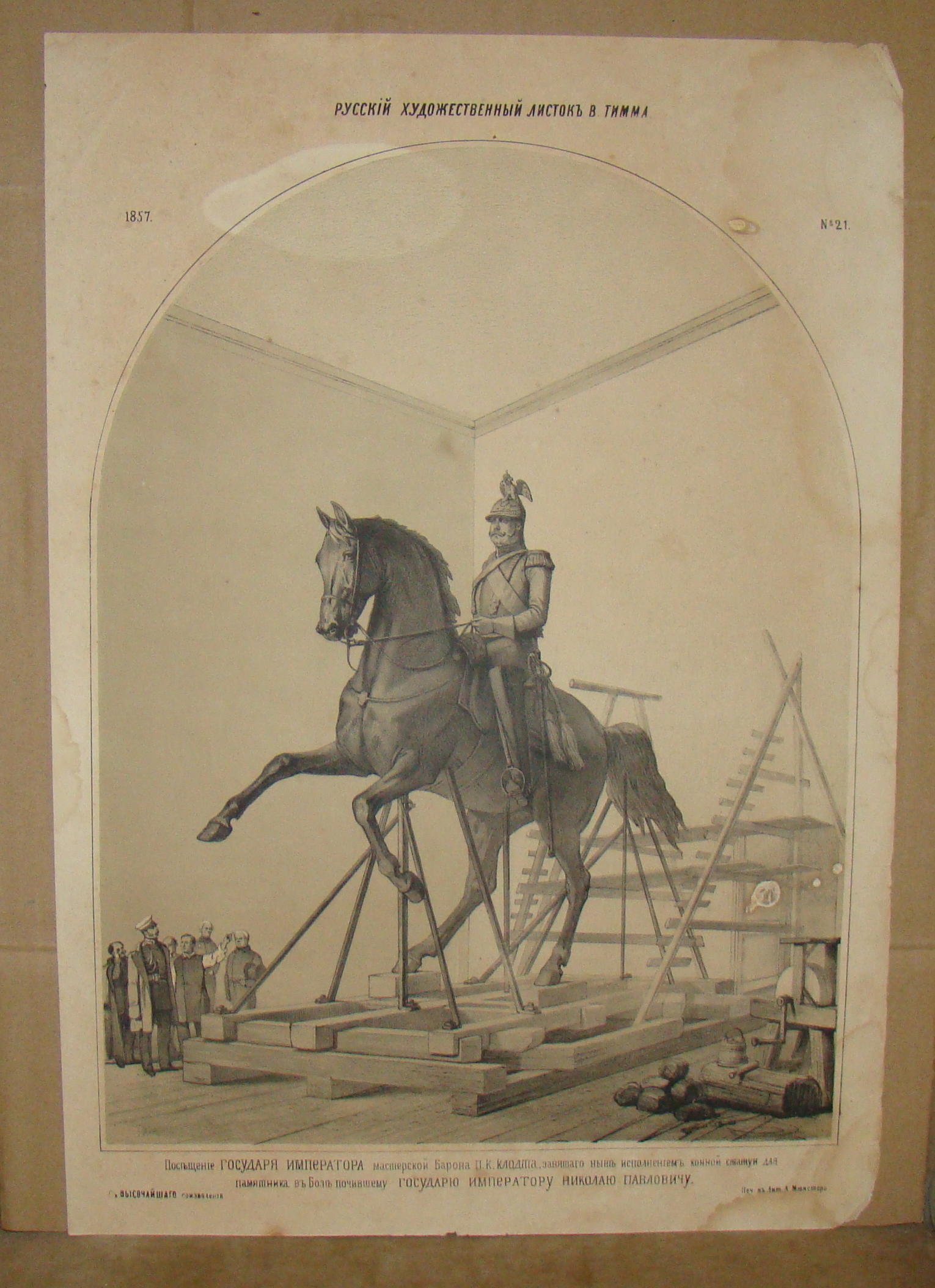 Литография "Посещение Государя Императора мастерской барона П. К. Клодта, занятого ныне исполнением конной статуи для памятника в Бозе почившему Государю Императору Николаю Павловичу". Литография вышла в свет в 1857 году в знаменитом издании "Русский художественный листок В. Тимма". Литография в два камня, высота 50, ширина 34 см. Хорошее состояние, незначительные временные пятна. Ценю в 7 500 руб. Оплата на карту Сбербанка. Отправка по РФ.