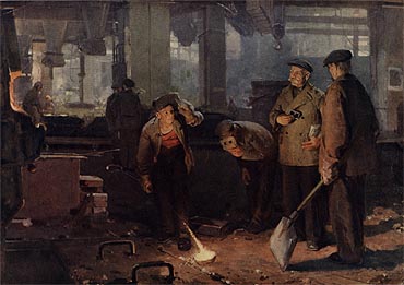 That totally quotation Skorobogatova TP from the biography of the artist: "But his diploma was not battle-piece, as cloth for industrial theme, which is quite outdated." Trial of steel "- the so-called diploma painting, which was presented in 1952 at the All-Union Exhibition of diploma works of art graduates from universities of the country which was a great success and at the same time formed the basis for discussion rather noisy, in the words of the author's own paintings, "quite scandalous." It crossed the most categorical of young artists and critics, from these discussions was born Danilevskii friendship with many Moscow artists, based on which were concerns and worries about the fate of Soviet art, already struggling from Tenet notorious "realism," 50-ies. Actually, the painting "The Trial of steel" for Danilevskii was the first significant test of himself as an artist, and although from a professional point of view it was quite prosperous, he remained dissatisfied with himself. In subsequent works, the artist sought to break away from the illustrative edification increasingly complicating the tasks of painting, trying to make a movie interesting, not only on the topic, but also for its artistic value. "
