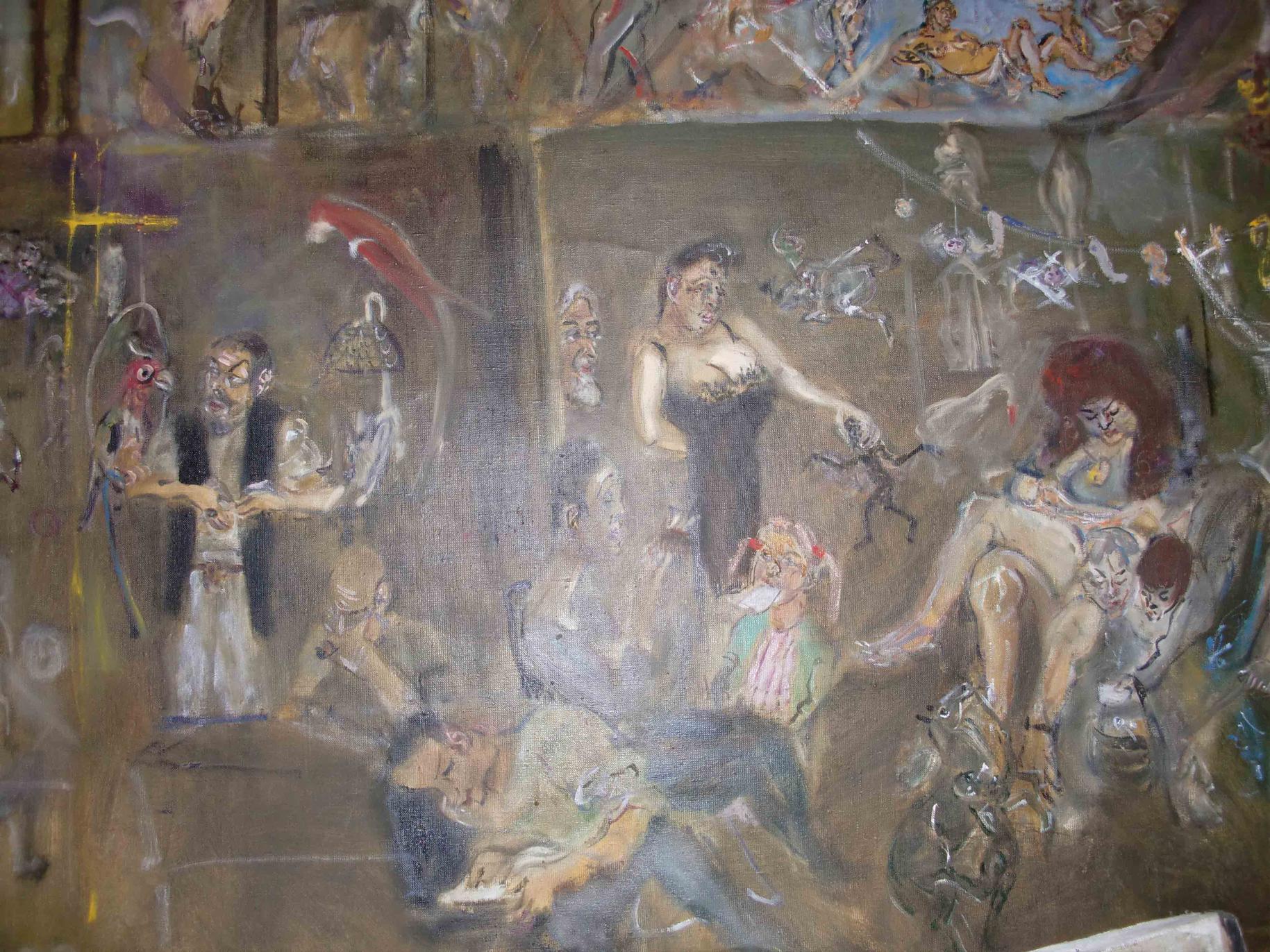 Распятие святого Андрея даже не задумывалось, а все произошло спонтанно. Натта доводила до ума картину «Процедура», новые мысли в замкнутом пространстве, как то приходили медленно, а уже смеркалось, к 17 часам подошли гости, звонок в дверь, Я Натте – Натт гости пришли на чай Она -А они с нами играть будут? -Сейчас узнаем … Открываю дверь, и обращаясь к гостям: -Проходите, гости дорогие. Раздевайтесь. -Да мы раздеваемся -Нет, догола раздевайтесь. -Это с какой такой стати? -А будем играть и рисоваться -Да без проблем, догола так догола… Натта, выйдя в коридор навстречу гостями, удивленно произнесла, -Надо же, впервые вижу, чтобы сразу согласились. Пока пили чай, Натта быстро режиссировала, набросили тряпки на новых актеров: -«Во, давай», распятие Святого Андрея, ты ложись, а ты как будто тянешь его за ноги на веревке, а ты его души… Связали ноги веревкой, для пущей достоверности, один тянет, другой душит. Так, позируя и разговаривая с Наттой, расставленные персонажи были запечатлены. Запала у Натты хватило на исполнение виденного. Главное достигнуто, на холсте воплощена её мысль. А потом «малярные работы», которые Натта не любит. Натта дважды возвращалась к этому полотну, привнося в него виденное вокруг, стараясь попасть в тематику, но всё стопорилось и осталось таким… Гости приходят и уходят, а персонажи сыгранные ими остаются на память, запечатленные в картине гениальной Наттой Ивановной Конышевой. Всем своим гостям принимающим участие в играх Натты Ивановны, всегда говорю,- почтите за честь быть изображенными Наттой Ивановной так честно, откровенно, талантливо Вас редкий художник изобразит. С 78-м днем Рождения НАТТА ИВАНОВНА. Крепкого здоровья, творческого экстаза и молодости души. фото картины "Андреевский флаг" и 8 фото картин из Испании |