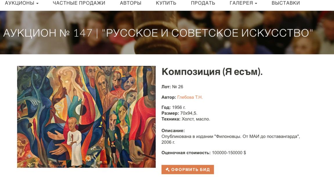 По мнению специалистов Вострецовой Людмилы Новомировны и Стерлиговой Ирины Анатольевны, выставленная на Совкоме картина «Я Есъм» не имеет отношения к авторству Татьяны Николаевны Глебовой. О чем оба искусствоведа уведомили аукционный дом, к сожалению, безрезультатно. |