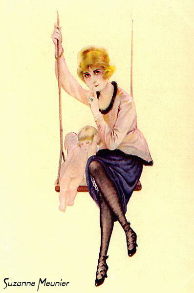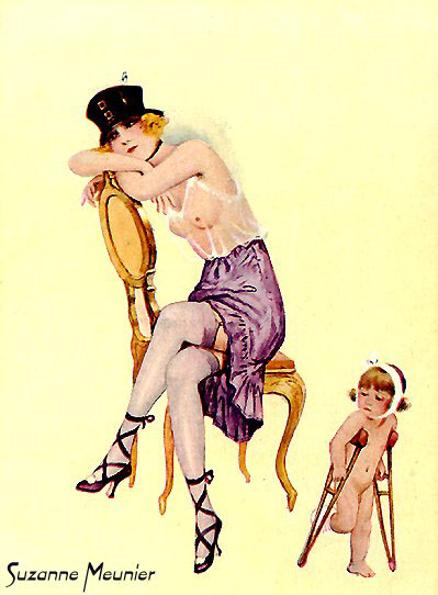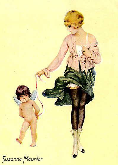 Бизнес-модель для Гапчинской выкована, наверное, еще во времена рококошных херувимчиков и купидончиков. Но особый расцвет педогламурного стиля был связан с почтовыми карточками. Елизавета Бём - это наш мастер этого жанра, а вот, к примеру, будуарные юморески француженки Сюзанны Меньер (Suzanne Meunier):