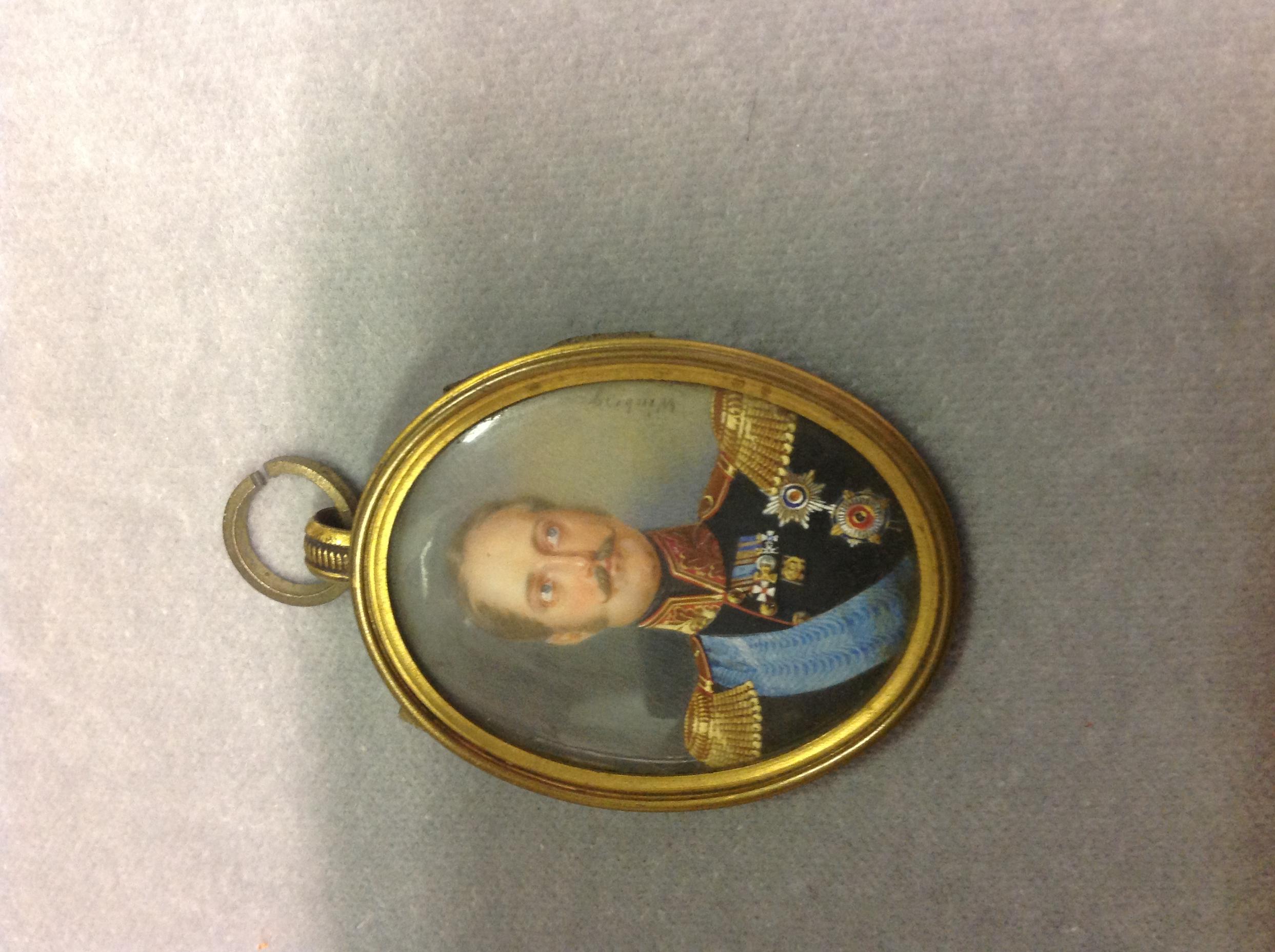 miniature depicting the Russian Emperor Nicholas I (1798-1851) in uniform with epaulettes , painting on the bone , subscription , artist Ivan Wünberg . Russian Empire , sir . XIX century .