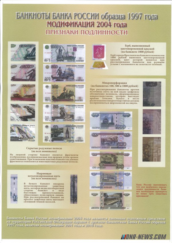 Центральный Республиканский Банк ДНР сообщает, что в последнее время участились случаи выявления поддельных банкнот номиналом 1000,00 рубля (одна тысяча российских рублей) образца 1997 г., модификации 2004 г. Выявленные поддельные банкноты отличаются высоким качеством воспроизведения изображения. Основная реализация поддельных денежных знаков происходит в местах розничной и оптовой торговли. С целью выявления поддельных денежных знаков Центральный Республиканский Банк рекомендует предприятиям, занимающимся торговлей, приобрести и использовать детекторы, определяющие подлинность купюр. Кроме того, ЦРБ ДНР рекомендует населению и предпринимателям при осуществлении операций с денежной наличностью обращать внимание на следующие признаки поддельных купюр: 1. Кипп-эффект – если посмотреть на банкноту под острым углом или направить ее против света, не будут видны буквы «РР». 2. Скрытые муаровые полосы (поле слева от памятника Ярославу Мудрому – отсутствуют), их не видно, под наклоном не появляются многоцветные линии. 3. Микроперфорация справа на купонном поле – цифры «1000», при ощупывании в этом месте бумага шероховата, а должна быть гладкой. 4. Герб г. Ярославля не меняет цвет с фиолетового на оливковый, остается фиолетовым. Появились у них, появятся и у нас.