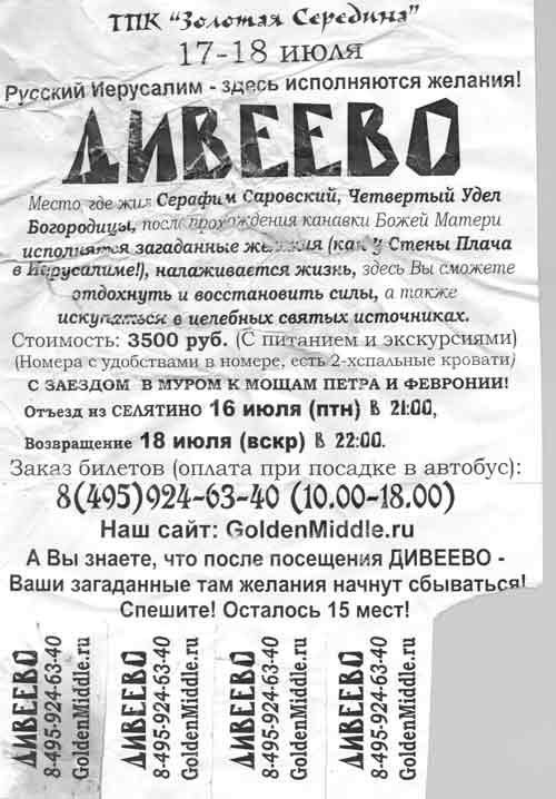 Как последний Емеля хочу. И оставив в Москве дурь мечтаний, Я в Дивеево с туром помчу. Вдоль канавки пройдусь не спеша, И в купальню помыться зайду. У источника жидкости выпью с ковша. Сформулирую четко мечту. Я уверена в этом, я знаю, Что желанье исполнится в срок. Чем сильнее о чуде мечтаю, Тем быстрее пошлет его бог. Ведь не деньги три тыщи, поверьте, И турфирма исполнит мечту. И поэтому сами проверьте Как вам с неба достанут звезду…