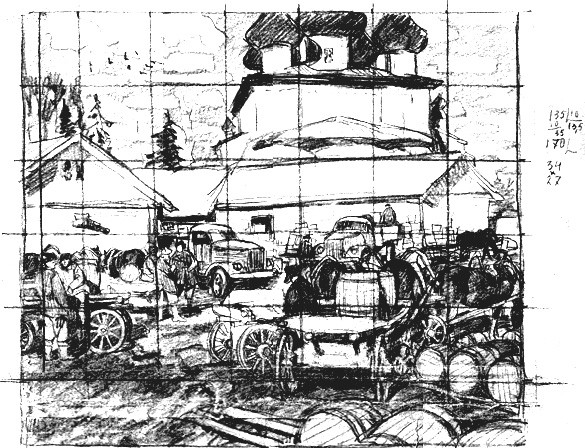 Оригинально работа называется "Каргополь. Склады сельпо". Она находится в Волгоградском музее изобразительных искусств. Как я ни бьюсь, не могу получить от них нормальное изображение. Работа была написана по двум этюдам и пяти рисункам, ну и, конечно, от впечатлений после поездки в этот старинный город. Помещаю здесь саму работу и подготовительный материал. Среди мужиков собравшихся перед складами, можно увидеть несколько знакомых художников (старый приём) , то же самое и с номерами грузовиков.Например 75-15 это номер первой машины Стожарова "Москвич 407", которую он потом поменял на "Волгу-21" в 1963 году. У этой машины был номер 05-54. Выставки, в которых эта картина участвовала : Вторая республиканская художественная -"Советская Россия'', Москва, 1965 Выставка произведений художников, удостоенных медалей Академии художеств СССР в 1967 году, Москва, 1968 "Русское изобразительное искусство с ХIII века до наших дней'', Варшава,1969 Передвижная выставка живописи Владимира Фёдоровича Стожарова, Сыктывкар-Архангельск-Киров-Ижевск-Горький-Куйбышев-Ульяновск-Астрахань-Кострома-Рязань-Брянск-Калинин-Тула-Калуга-Смоленск, 1972-1974 Персональная выставка, Академия художеств, Москва,1977 Вторая персональная выставка, 1977-1979 Персональная выставка, ГДР, 1979 (Может ещё где музей выставлял, не знаю) |