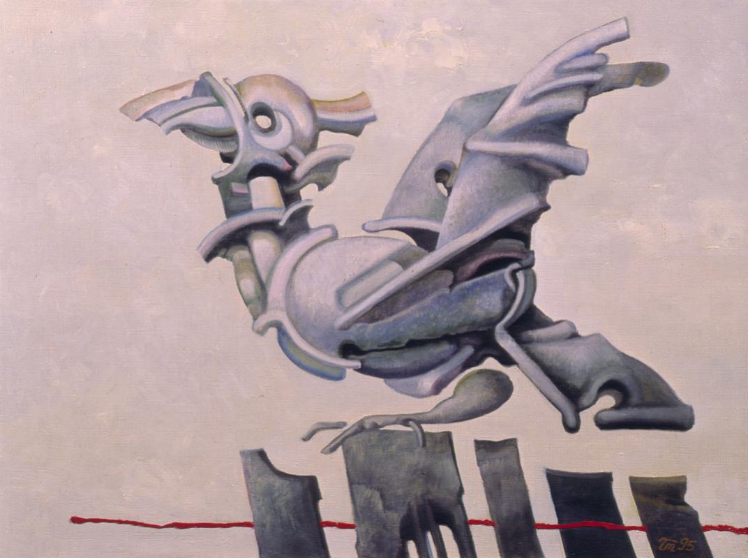 Художник работает в самых различных техниках. Он рисует акварелью, маслом и цветными карандашами на бумаге необычных сортов, делает коллажи и монотипии. В живописи Геннадия Трошкова яркие и чистые цвета, заключены в затейливые формы. Они находятся в сложном взаимодействии - "взимном качании" в поисках равновесия, которое все же обретается, лишь только взгляд зрителя отрывается от деталей фокусируется на изображении в целом. Эти работы полны внутренней энергии, и при ближайшем рассмотрении то, что казалось вначале лишь красивым декоративным приемом, оказывается вполне драматичным сюжетом "о борьбе и обретении равновесия". В графике художник развивает ту же тему взаимодействия осколков и пятен цвета внутри одной работы. Но здесь, на бумаге все куда легче, чем на холсте. Кисть летает свободно и не ограничивает себя холодными футлярами форм. |