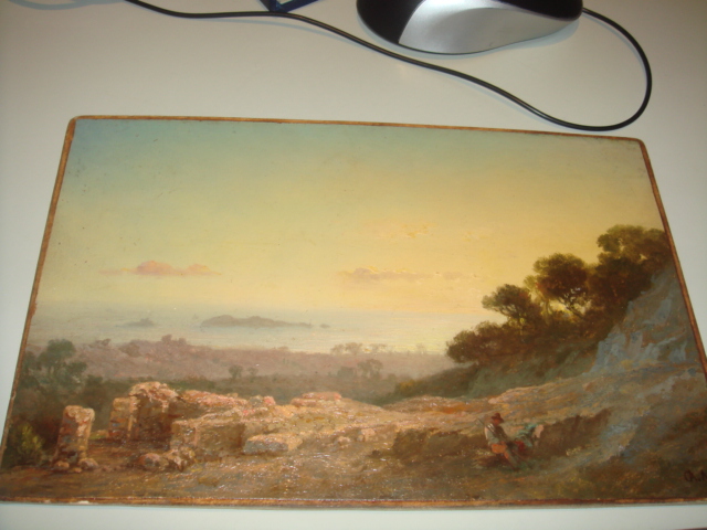 Масло, бумага, наклеенная на картон. Скорее всего, юг - Крым или Италия. Смотрится на 1850е-70е. И - загадочная (для меня) монограмма... |