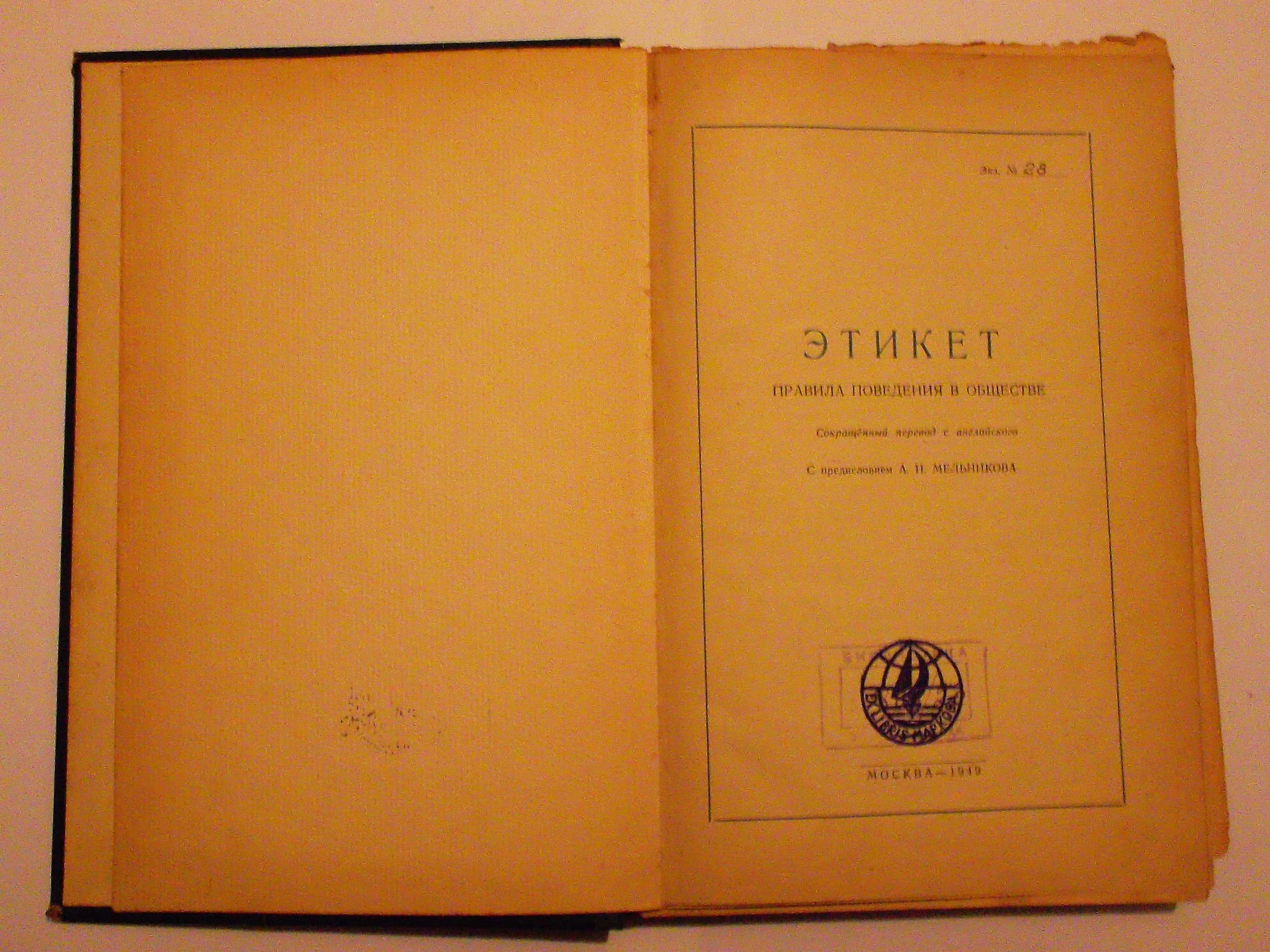Книга "Этикет". Для служебного пользования. 1949 год Автор: Нет Название: Этикет Жанр: Справочные материал Перевод: На русский язык с вышедшей в Америке одноименной книге Издание: Нет Год издания: 1949 год, Москва Переплёт: Твердый (оригинальный) Количество страниц: 192 Размер: 23х15,5 Цена: Нужна оценочная стоимость Состояния книги хорошее. Все страницы на месте. Содержит 17 черно-белых иллюстрированных вклеек Содержит надпись на первой странице, в верхнем правом углу - Экз. № 28 В книге имеется 3 печати (есть на фото): Первая печать - экслибрис владельца. Вторая печать - библиотеки. Третья печать - библиотеки. Текст ПРЕДИСЛОВИЯ книги (довольно таки интересный!): "Предлагаемая вниманию читателя книга "Этикет", вышедшая в Америке и переведённая на русский язык, относится к числу тех книг о правилах "хорошего тона", которые в изобилии выпускаются издательствами капиталистических стран Европы и Америки" "Эта книга представляет интерес лишь для узкого круга советских читателей как своего рода справочные материал, знакомящий с основными правилами поведения в "высших" слоях американского буржуазного общества" "Знание этих правил в некоторых случаях может оказать помощь советскому человеку, если ему по долгу службы придётся быть в среде "высших" слоёв буржуазного общества" "Положение советского гражданина, находящегося за рубежом, совершенно отлично от положения гражданина любой другой страны. Советский человек должен всегда помнить, что он является гражданином великого социалистического государства и "...стоит головой выше любого зарубежного высокопоставленного чинуши, влачащего на плечах ярмо капиталистического рабства" (Сталин). Поэтому все его поступки должны пронизывать чувство собственного достоинства, чувство гордости за свою великую Родину. Отсюда же должна вытекать и его особая требовательность к себе" "В целом книга "Этикет" может быть в известной степени использована только как справочный материал" "Для служебного пользования" - Так написано, на твердом переплёте лицевой стороне книги, в правом верхнем углу. (Есть фото) Данная книга предназначалась строго, как справочный учебный материал, для будущих разведчиков, работающих за рубежом. Книга раньше находилась в библиотеке Военной академии (бывшая военно-дипломатическая академия). Где сейчас готовят офицеров ГРУ. Во времена СССР академия именовалась Военная Академия Советской Армии (ВАСА). Последний раз редактировалось Галина Арт; 13.09.2013 в 11:58. |