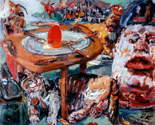 Мюнхенское соглашение 1938 года сделало Прагу небезопасным убежищем. В сентябре Кокошка уехал в Англию. Там было безопасно, к тому же в Англии его искусство было хорошо известно. Однако супруги были отчаянно бедны, в 1939 году они поселились, где дешевле - в Корнуолле. Оскар рисовал местные пейзажи акварелью, а Ольга торговала выпечкой в магазине, чтобы как-то свести концы с концами. В следующем году, они перебрались в Лондон, поскольку Кокошка был убежден, что соседи с подозрением относились к ним. Но Лондон угнетал его: "Что я должен сделать в этом дыре (так он называл свою лондонскую квартиру)? Я должен придумать новые темы для моих картин. Когда наступает весна, я чувствую себя, как перелетная птица, хочется оставить город и рисовать что-то простое, например, кузнечиков. Когда я возвращаюсь в город, пейзажи превращаются в политические картины. Мучают сердечные боли, но я не могу от этого избавиться". Благосостояние Кокошки улучшается после войны. В 1945 году он получил символическую награду в разбитой войной Вене: выставку, в которой, кроме его картин, были представлены работы Климта и Шиле, к тому времени обоих их уже не было в живых. В 1947 году была большая ретроспективная выставка в Кунстхалле в Берне, а в 1952 году его творчеству было посвящено 26-е биеннале в Венеции. Кокошка стал британским гражданином в 1947 году, но он не стремился оставаться в стране, где чувствовал себя неуютно. В 1953 году он возглавил международную Летнюю академию изобразительного искусства в Зальцбурге, и таким образом, восстановил связь с Австрией, где начал свою карьеру, и в этом же году поселился на одном из курортов Женевского озера. Теперь он был чрезвычайно знаменитым художником, но держался в стороне от политической и общественной жизни, поэтому его смерть в 1980 году на курорте в Монтрё прошла довольно незаметно. В творчестве Кокошки явно прослеживается эволюция стиля и интересов. До Первой мировой войны он рисовал, главным образом, портреты, которые замечательны глубиной проникновения во внутренний мир модели. Стиль художника этого периода характеризуется тонкой трактовкой форм и свободой от описательного реализма. Однако постепенно в его манере стал проявляться больший интерес к технике живописи. Но при этом сохранялось и тонкое восприятие модели. В 1920-е годы Кокошка считался одним из наиболее одаренных немецких экспрессионистов. В этот период он обратился к пейзажу, который стал его любимым жанром. Интровертный характер его ранних произведений теперь уступил место работам, в которых импульс черпался извне; в них использовались смелые пластические природные формы, вылепленные пастозными мазками в ярких тонах. Во время Второй мировой войны в творчестве Кокошки наступило временное затишье, но затем последовали работы, в полной мере сохранявшие экспрессивность и гораздо более тонкие по цвету и рисунку. По тексту Эдварда Льюси-Смит |