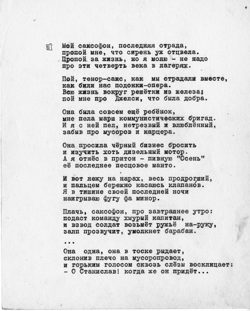 ни даже сколько-нибудь масштабной славы, хотя знатоки отмечали незаурядность его работ, неоднократно выставлявшихся и в Союзе, и за его пределами. Впрочем, это был обычный удел талантливой личности, не вписавшейся в рамки режима с его тяготением к всеобщей усредненности. Сегодня его имя помнят немногие - пожалуй, несколько днепропетровских фотографов да несколько сочувствующих. До недавнего времени считалось , что его работы безвозвратно утеряны. К счастью, это оказалось не так….» Наверное, он родился не в свое время. Совок не простил ему его таланта. Он ненавидел совок и советский образ жизни. Но альтернатив не было. Ухожу навсегда, и никто не кричит мне 'Постой!" Я старался у них. Нужным быть я хотел и послушным Выдают с трудовой лист расчётный обидно пустой, неуютный такой, как дежурный фургон спецмедслужбы